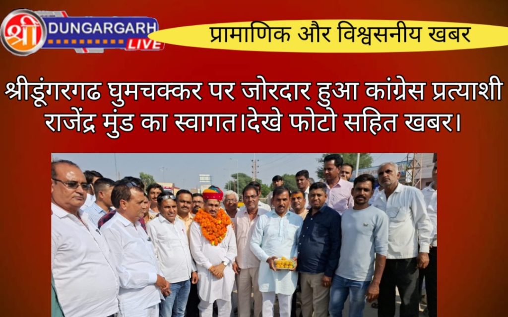 श्रीडूंगरगढ़ में झंवर बस स्टैंड और घुमचक्कर पर अम्बिका मेडिकल स्टोर के सामने कांग्रेसी कार्यकर्ताओं ने कांग्रेस जिंदाबाद के नारे लगाकर कांग्रेस प्रत्याशी का जोरदार स्वागत किया। लूणकरणसर से कांग्रेस के प्रत्याशी डॉ राजेन्द्र मूंड के टिकट मिलने के बाद काफिले के साथ दिल्ली से अपने पैतृक गांव मुंडसर जाते वक्त श्रीडूंगरगढ़ में कांग्रेसी कार्यकर्ताओं ने जोरदार स्वागत किया।