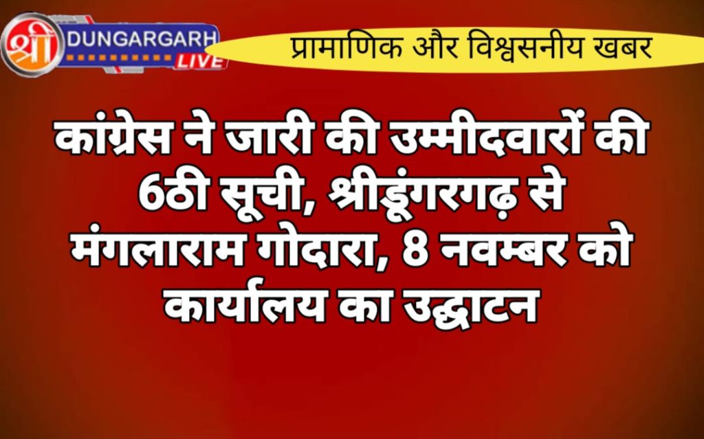 राजस्थान विधानसभा चुनाव में कांग्रेस ने अभी तक 44 उम्मीदवारों की घोषणा नही की थी, लेकिन कहा ये जा रहा है कि कांग्रेस ने अपने उम्मीदवारों को फोन द्वारा सूचना दे दी है कि वो अपना नामांकन दाखिल करें। सूची को किसी भी समय जारी कर दिया जायेगा। अब कांग्रेस ने 23 उम्मीदवारों की सूची जारी की है। श्रीडूंगरगढ़ से पूर्व विधायक मंगलाराम गोदारा को पार्टी ने अपना उम्मीदवार बनाया है। गोदारा ने कल ही अपना नामांकन दाखिल कर दिया था और आगामी 8 नवम्बर को धूमधाम से अपने कार्यालय का उद्घाटन अपने समर्थकों के साथ करने की घोषणा कर दी है। आज जब कांग्रेस ने अपने उम्मीदवारों की 6ठी सूची जारी की तो श्रीडूंगरगढ़ से पूर्व विधायक मंगलाराम गोदारा के नाम पर भी मुहर लगा दी।