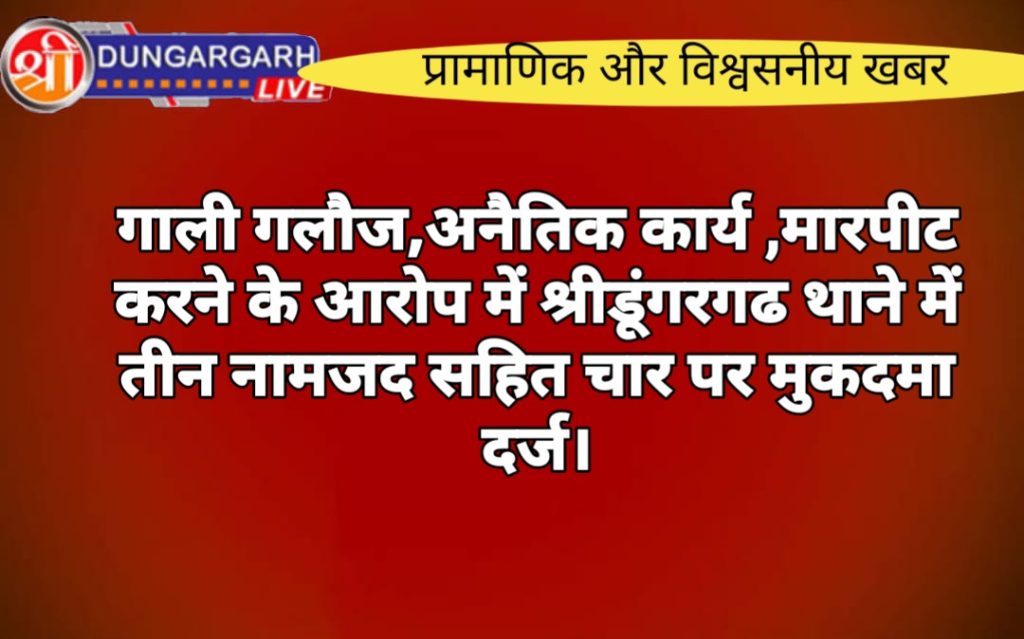 श्रीडूंगरगढ़ थाने में मुकदमा दर्ज करवाते हुए हरिप्रकाश पुत्र आईदान जाती प्रजापत निवासी बिग्गा बास श्रीडूंगरगढ़ ने बताया कि मेरे ही पड़ोस में रहने वाले आरोपी रामप्यारी पति सीताराम, सुमन पुत्री सीताराम, मुकेश पुत्र सीताराम और एक अन्य के खिलाफ मुकदमा दर्ज करवाते हुए बताया कि आरोपी मेरे घर के पास ही बीच चौराहा में एक बनावटी दुकान खोखा लगते हैं इसमें सब्जी वगैरह बेचते हैं रामप्यारी और सुमन का चरित्र ठीक नहीं है यहां पर लगातार अनैतिक लोगों का आना-जाना रहता है जिस मोहल्ले का माहौल खराब होता है हमने उनको दो-चार बार मना किया टोका टाकी की तो आरोपी मेरे को ही गाली गलोज करने लगे और मुझसे मारपीट करने लगे मुझ से ईर्ष्या रखने लगे मेरे घर वालों ने मुझे बिच बचाव करके छुड़वाया नहीं तो आरोपी मुझे मार देते। श्रीडूंगरगढ़ थाने में तीन नामजद सहित एक अन्य पर मुकदमा दर्ज कर लिया है और जांच सुशीला मीणा को सौंप दी है।