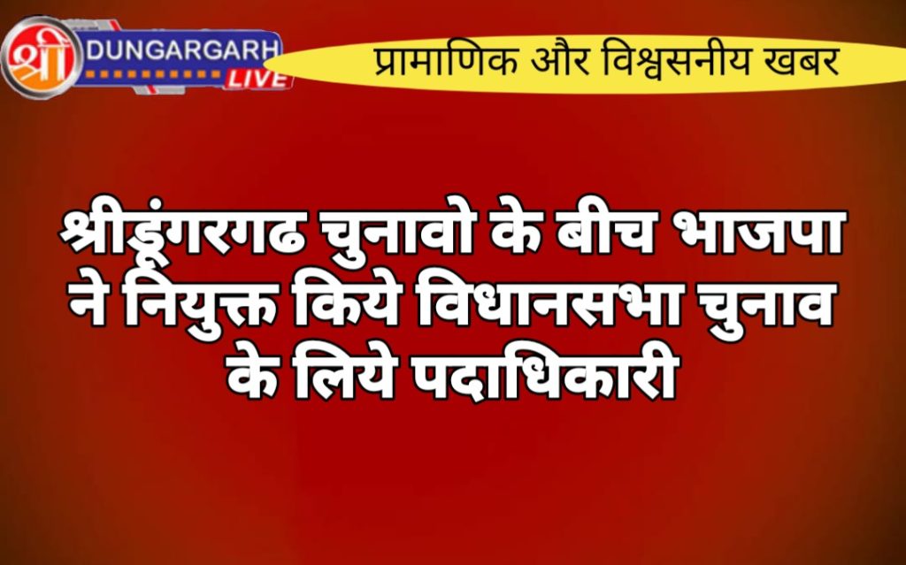 विधानसभा चुनाव के महासंग्राम शुरू हो चुका है। सभी पार्टियों ने अपनी जोर आजमाईश आरम्भ कर दी है। चुनावो के बीच मे भाजपा के युवा संगठन भाजयुमो ने राजस्थान विधानसभा चुनावों के लिये विधानसभा संयोजक और सहसंयोजक की नियुक्ति की घोषणा की है। श्रीडूंगरगढ़ विधानसभा क्षेत्र के लिये संयोजक आईदान पारीक को और सहसंयोजक मनोज गुर्जर को नियुक्त किया है।