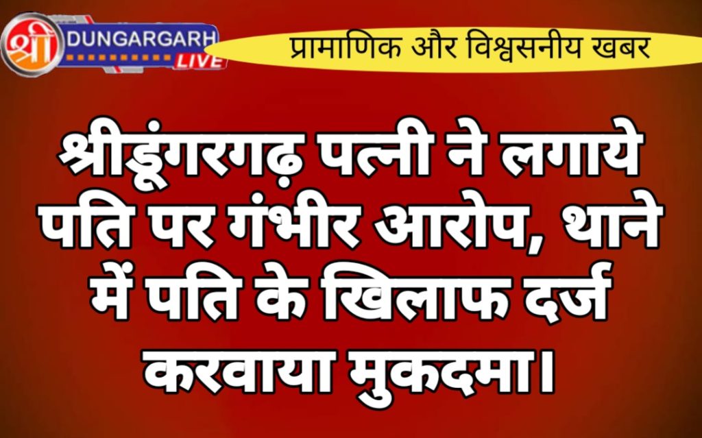 श्रीडूंगरगढ़ थाने में पति के खिलाफ मुकदमा दर्ज कराते हुए आशा देवी पत्नी रिद्धीकरण सोनी निवासी श्रीडूंगरगढ़ ने आरोप लगाया कि मेरा पति मुझे शारीरिक, मानसिक एवं आर्थिक रूप से प्रताड़ित करता है मैं इसकी शिकायत कहीं नहीं कर सकूं इसके लिए मुझे झूठे नोटरी दस्तावेज पर साइन करवा रहा है मुझ पर काला जादू का आरोप लगा रहा है एवं परिवार के किसी अन्य सदस्यों से मिलने नहीं दिया जा रहा है मेरी दो पुत्री का मुझे भरण पोषण भी नहीं दे रहा है आए दिन मेरे को गाली गलौज करता है एवं चरित्रहीन कह कर पुकारता है रिधकरण सोनी पर मुकदमा दर्ज कर आगे की कार्रवाई एसआई सुशीला मीणा को शॉप दी है