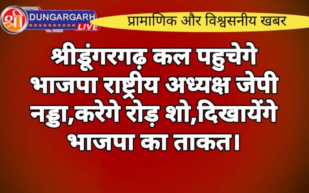 भाजपा के राष्ट्रीय अध्यक्ष जेपी नड्डा मंगलवार को श्रीडूंगरगढ़ पहुंचेंगे। यंहा पर वें भाजपा प्रत्याशी ताराचंद सारस्वत को विजयी बनवाने का संकल्प स्थानीय कार्यकर्ताओं दिलवाएंगे। नड्डा का रोड शो कल दोपहर 2 बजे हाई स्कूल के सामने ताल मैदान से शुरू होगा और मुख्य बाजार के रास्ते घूमचक्कर तक पहुंचेगा। भाजपा कार्यकर्ताओं में राष्ट्रीय अध्यक्ष आने का कार्यक्रम तय होने बाद जबरदस्त उत्साह और जोश दिखाई दे रहा है और रोड शो की तैयारियों में जुट गए है।