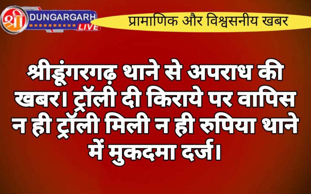श्रीडूंगरगढ़ थाने में मुकदमा दर्ज करवाते हुए देवीलाल पुत्र स्व रेवंतराम जाति उपाध्याय ब्राह्मण निवासी हाई स्कूल रोड कालू बास ने बताया कि मैंने एक ट्रैक्टर की ट्रॉली कोजूराम पुत्र पूर्णाराम जाति नायक निवासी कीटनासर भटियान को दी थी 2 महीने के लिए ट्रैक्टर की ट्रॉली दी थी जिसका भाड़ा ₹24000 तय हुआ था आरोपी ने मुझे ₹10000 देकर हमने लिखा पढ़ी की थी और बाकी के 14000 हजार रुपिया एक दो महीने में देने की बात हुई थी ।जब 2 महीने बाद मैं आरोपी से संपर्क किया तब आरोपी ने कहा कि मेरी तो नियत ही तुम्हारी ट्रॉली हड़पने की थी अब तुम्हें ट्रॉली नहीं मिलेगी। मेने थाने में आकर उसकी शिकायत की। श्रीडूंगरगढ़ थाने में आरोपी कोजुराम पुत्र पूर्णाराम जाति नायक निवासी कितासर भटियान के खिलाफ मुकदमा दर्ज कर लिया है और जांच बलबीर सिंह को सौंप दी है