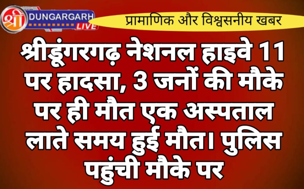 ट्रक व पिकअप की भिड़ंत भिड़ंत 3 जनों की मौके पर ही मौत की सूचना घायलों को लाया जा रहा श्रीडूंगरगढ़ नेशनल हाईवे 11 सातलेरा Gss के पास हुआ हादसा प्राप्त सूचना के अनुसार नेशनल हाईवे पर गांव बिग्गा एवं सातलेरां के बीच में एक ट्रक एवं पिकअप की आमने सामने की भीड़ंत हो गई। भीडंत इतनी भयंकर थी कि पिकअप बुरी तरह से कुचली गई एवं पिकअप में सवार तीन जनों की मौके पर ही मौत हो गई। दो घायलों को गंभीर अवस्था में श्रीडूंगरगढ़ लाया गया जिनमें से एक की रास्ते में मौत हो गई। मौके पर आपणो गांव सेवा समिति, गरीब सेवा संस्थान के कार्यकर्ता अपनी अपनी एम्बुलैंस लेकर पहुंच गए एवं पुलिस भी मौके पर पहुंची है। बताया जा रहा है कि पिकअप श्रीडूंगरगढ़ की और आ रही थी एवं ट्रक जा रहा था।