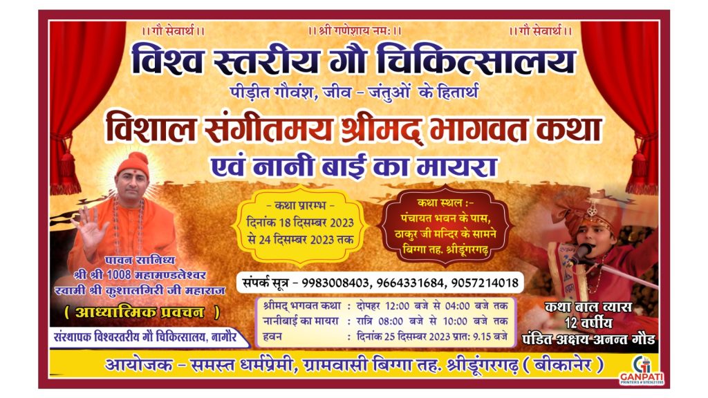 विश्व स्तरीय गौ चिकित्सालय पीड़ित गौवंश,जीव जंतुओं के हितार्थ सात दिवसीय विशाल संगीतमय श्रीमद भागवत कथा एवम नानी बाई मायरा का आयोजन ग्रामवासियों की ओर से किया जा रहा है।भागवत कथा ज्ञान यज्ञ का समापन 24 दिसम्बर को तथा हवन 25 दिसम्बर को सुबह सवा नो बजे से होगा