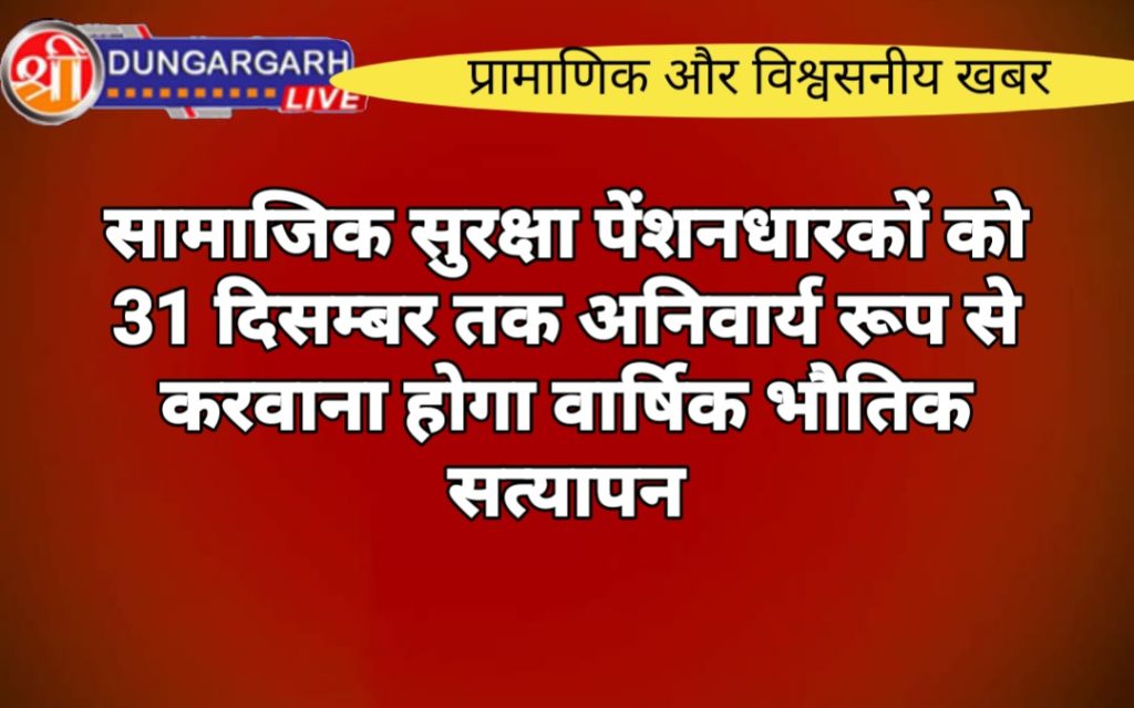 सामाजिक सुरक्षा पेंशन योजनान्तर्गत पेंशनर्स को 31 दिसंबर तक वार्षिक भौतिक सत्यापन से करवाया जाना आवश्यक है।