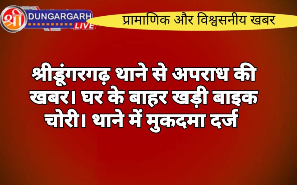 श्री डूंगरगढ़ थाने में मुकदमा दर्ज कराते हुए उमेश पुत्र रामलाल शर्मा निवासी वार्ड संख्या-28 आडसर बास ने बताया कि बाजार में उसकी दुकान है और वह सोमवार दोपहर को खाना खाने के लिए आडसर बास स्थित अपने घर पर आया था। वह बाइक घर के बाहर खड़ी कर अंदर खाना खाने चला गया। घण्टे भर बाद वापस आकर देखा, तो बाइक नही मिली। इधर-उधर तलाश करने पर भी बाइक का पता नही चला। अज्ञात व्यक्ति उसकी बाइक चोरी कर ले गया। इस संबंध में पीड़ित ने थाने में रिपोर्ट दी है।श्रीडूंगरगढ़ अस्पताल में पुलिस सिपाही की तैनाती के बाद जेब कतरों द्वारा चोरी की वारदातों पर अंकुश लगा है। लेकिन अब कस्बे के अन्य जगह चोरी की घटना सामने आ रही हैं