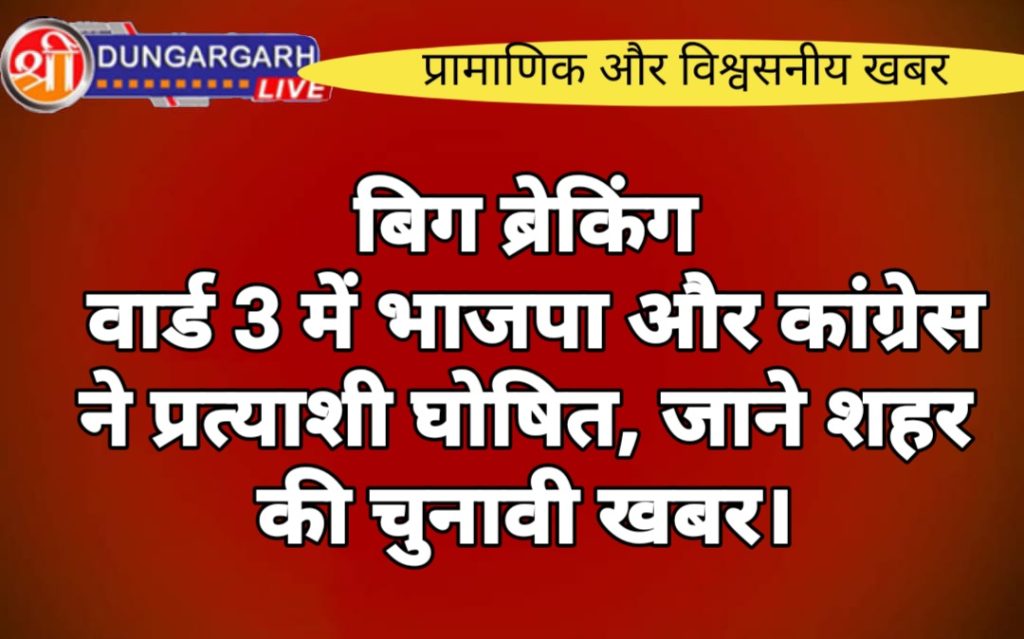 वही कांग्रेस ने भी वार्ड नं 3 में प्रत्याक्षी की घोषणा कर दी है आज कांग्रेस के पूर्व विधायक मंगलाराम गोदारा ने ठाकुरजी मंदिर के पास वार्ड सभा का आयोजन किया और उपस्थित नागरिकों की सहमति से वार्ड के कांग्रेसी प्रत्याशी के रूप में मालाराम प्रजापत के नाम की घोषणा की। कांग्रेस समर्थकों ने गोदारा का सम्मान करते हुए प्रजापत की विजय के लिए पुरजोर प्रयास करने की बात कही।