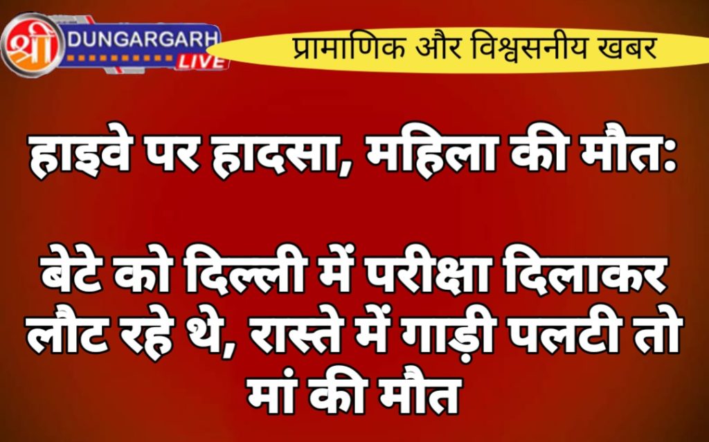 श्रीडूंगरगढ़ से बीकानेर की ओर आ रही एक एसयूवी कार अनियंत्रित होकर पलट गई। इसमें सवार महिला की मौत हो गई जबकि उसके पति और पुत्र गंभीर घायल हो गए। जिन्हें पीबीएम अस्पताल के ट्रोमा सेंटर पहुंचाया गया है। दोनों की स्थिति गंभीर बनी हुई है।नेशनल हाइवे पर धरती धोरां री होटल के पास एक एसयूवी कार पलट गई। इसमें सवार कैलाश चंद सांखला व उनका पत्र उज्ज्वल घायल हो गया।