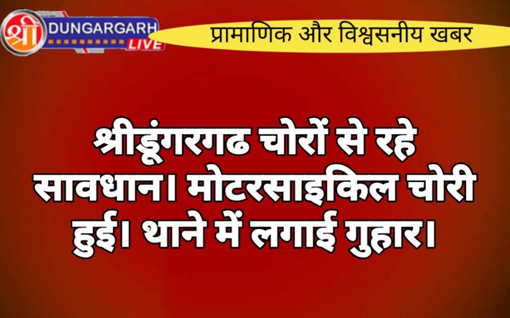 श्रीडूंगरगढ़ थाने में चोरी का मुकदमा दर्ज करवाते । लखासर निवासी गोर्वधन पुत्र आदूराम जाती जाट उम्र 42 साल में बताया कि मोटरसाइकिल श्याम जी मंदिर गोपाल गौशाला श्रीडूंगरगढ़ के पास खड़ी करके ट्यूशन की फीस देने के लिए अंदर गया था और वापस बाहर आया तब मेरी मोटरसाइकिल वहां पर नहीं मिली किसी अज्ञात व्यक्तियों ने मोटरसाइकिल का लॉक तोड़कर वहां से चोरी करके ले गए। थाने में अज्ञात व्यक्ति के खिलाफ मुकदमा दर्ज कर लिया है और जांच सुरेश कुमार गुर्जर को सौंप दि हैं।