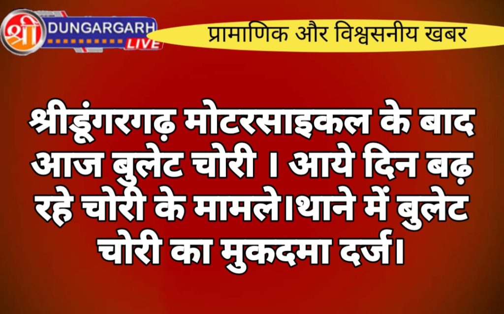 श्रीडूंगरगढ़ क्षेत्र लगातार चोरी के मामले बढ़ रहे हैं पिछले 5 दिन से लगातार मोटरसाइकिलों की चोरिया और कल हुई ज्वेलर्स की दुकान में चोरी। आम जनता और व्यापारी इसे बहुत परेशान है इन समस्याओं से कब मिलेगा निजात। आज एक और बुलेट बाइक की चोरी की घटना सामने आई है पीड़ित नदीम पुत्र जवाहर काजी उम्र 23 साल निवासी बिग्गा बास ने बताया कि मेरी बुलेट बाइक मैंने तेरापंथ भवन कालू बास के सामने वाली गली में खड़ी करके में जिम में गया था जब मैं वापस लौटा तब उसे वहां पर मेरी बुलेट बाइक नहीं मिली मैं इधर-उधर पता किया और एक जगह सीसीटीवी कैमरे में देखा तब एक व्यक्ति मेरी बुलेट ले जाते हुए दिखाई दिया । श्रीडूंगरगढ़ थाने में अज्ञात व्यक्ति के खिलाफ मुकदमा दर्ज कर लिया है और जांच एसआई हेतराम को सौंप दी है