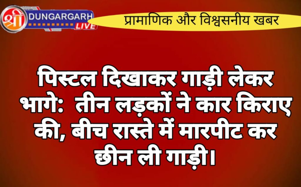 कोठारी अस्पताल के पास बने कार स्टेंड पर पहुंचे तीन युवकों ने पहले कार किराए की। बीच रास्ते में ड्राइवर को पिस्टल दिखाई और कार छीनकर ले गए। इस आशय का मामला बीकानेर के नयाशहर थाने में दर्ज कराया गया है, जिसके बाद पुलिस इन तीन युवकों की तलाश में जुट गई है।