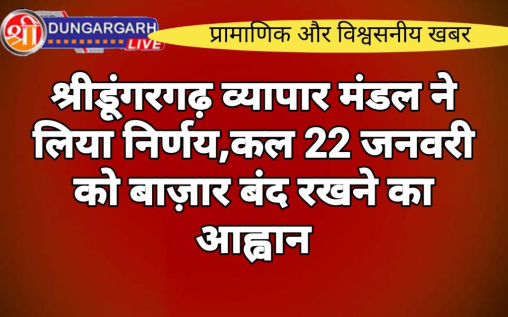 22 जनवरी को अयोध्या में श्री राम की प्राण प्रतिष्ठा होगी। ऐसे में श्रीडूंगरगढ़ में इस दिन को भव्यता के साथ मनाने के लिए व्यापार मण्डल ने इस दिन बाज़ार बन्द रखने का आह्वान किया है। व्यापार मण्डल के श्याम सुंदर पारीक ने बताया कि इस दिन पूरे देश में इस उत्सव को जगह जगह मनाया जाएगा। इस दिन नागरिक उत्सव को लेकर व्यस्त रहेंगे। पारीक ने व्यापारियों से अपने प्रतिष्ठान बंद रखकर इस दिन के भव्य आयोजनों में शामिल होने की बात कही है। वहीं क्षेत्र के नागरिकों से इस उत्सव को भव्यता के साथ मनाने की अपील की है।