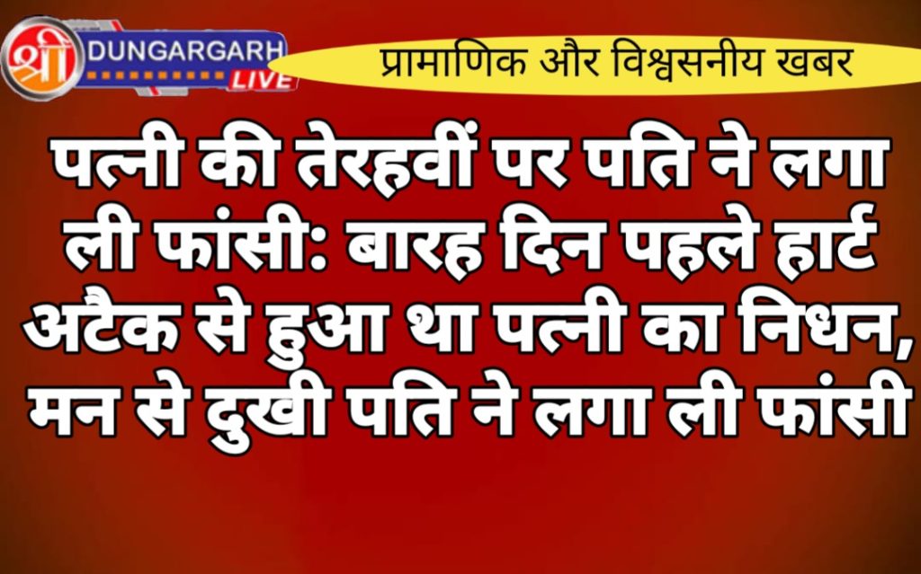 श्रीडूंगरगढ़ में एक व्यक्ति ने अपनी पत्नी की मृत्यु की तेरहवीं के ठीक अगले दिन कमरे में सुसाइड कर लिया। पति ने मंगलवार सुबह फांसी का फंदा लगा लिया। पति-पत्नी के दो बच्चे भी है, जिसमें एक बेटा और दूसरी बेटी हैं। अब दोनों के सिर से मां-बाप का साया उठ गया है।