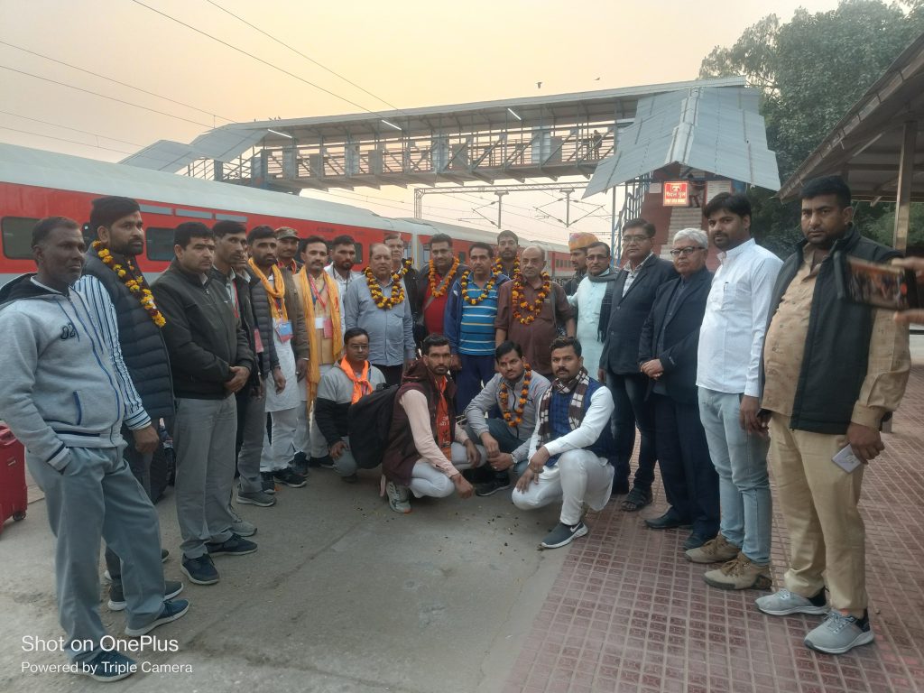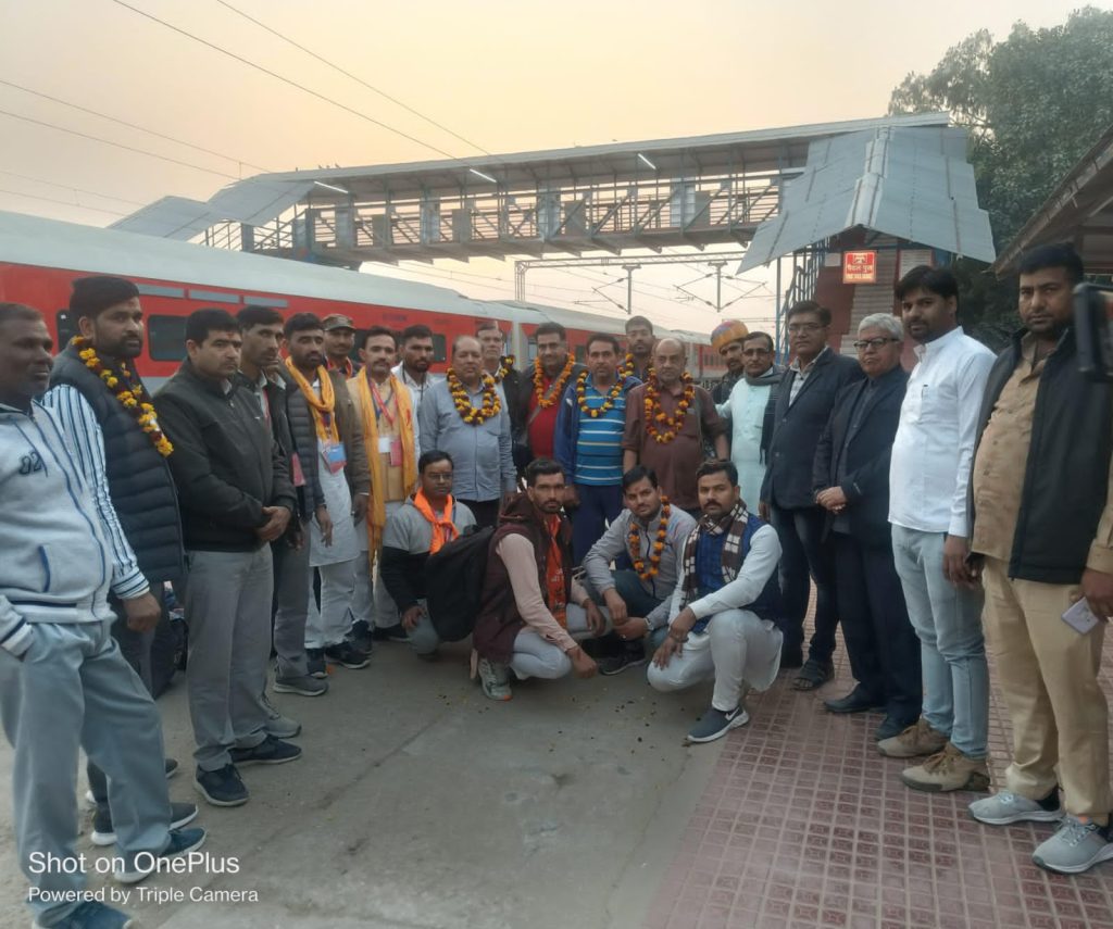 अयोध्या में भव्य श्रीराम मंदिर में प्रभु श्रीराम के दर्शन कर धर्म नगरी श्रीडूंगरगढ़ पहुंचने पर रामभक्तों की पहली टोली में भंवरलाल शर्मा,बजरंग गोदारा,ओमप्रकाश लखारा,दौलतराम सुथार,लेखराम गोदारा,रामलाल सिद्ध,भंवरलाल दुगड़,शुभकरण पंचारिया,दीपक हिन्दू,सहीराम सायच, मुखराम सिद्ध,लक्ष्मण सिद्ध,फतेह सिंह जांगिड़,शिवरतन राजपुरोहित,ओमनाथ सिद्ध,रुघनाथ सिद्ध,बलराम सिद्ध,शिवरतन राजपुरोहित सहित सभी रामभक्तों के श्री डूंगरगढ़ रेलवे स्टेशन पहुंचने पर स्थानीय भाजपा कार्यालय में बैठे संगठन पदाधिकारियों को सूचना मिलने पर तुरन्त रेलवे स्टेशन पहुंवहकर रामभक्तों का माला पहना कर किया भव्य स्वागत ,सत्कार और जय श्री राम , जय सियाराम के नारे लगाते हुए भक्तों ने अयोध्या में प्रभु श्रीराम के भव्य मंदिर में दर्शन के दौरान बिताएं धार्मिक स्थलों एवं धार्मिक पलों को श्रीडूंगरगढ़ वासियों से साझा किए। इस दौरान भाजपा श्रीडूंगरगढ़ शहर अध्यक्ष महावीर प्रजापत एवं महामंत्री सुरेन्द्र चुरा ने सभी रामभक्तों को माला पहनाकर स्वागत किया। इस अवसर पर भाजयुमो जिला उपाध्यक्ष भवानी प्रकाश तावनियाँ ने कहा प्रभु श्री राम मंदिर बनने से रामभक्तों को 500 वर्षों बाद सौभाग्य प्राप्त हुआ। इस दौरान राकेश पांडिया,लालचंद प्रजापत,भेराराम डूडी आदि ने स्वागत किया।