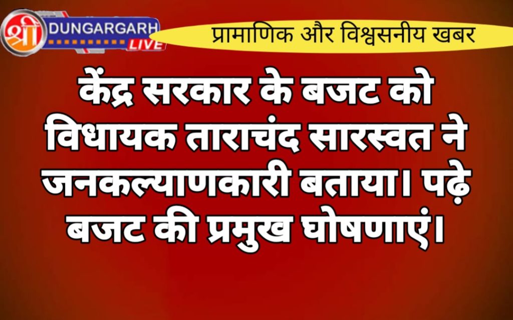 बजट पर प्रतिक्रिया देते हुए श्रीडूंगरगढ़ विधायक ताराचंद सारस्वत ने कहा की यह बजट किसान, युवा, जरूरतमंद एवं महिलाओं को केंद्रबिंदु मानकर प्रधानमंत्री नरेंद्र मोदी के दूरदर्शी नेतृत्व में प्रस्तुत अंतरिम बजट समावेशी एवं सर्वस्पर्शी है, यह बजट अमृतकाल में विकसित भारत के संकल्प को साकार करने व अर्थव्यवस्था की दृष्टि से सक्षम व सशक्त भारत को और समृद्ध बनाने में सहायक सिद्ध होगा।