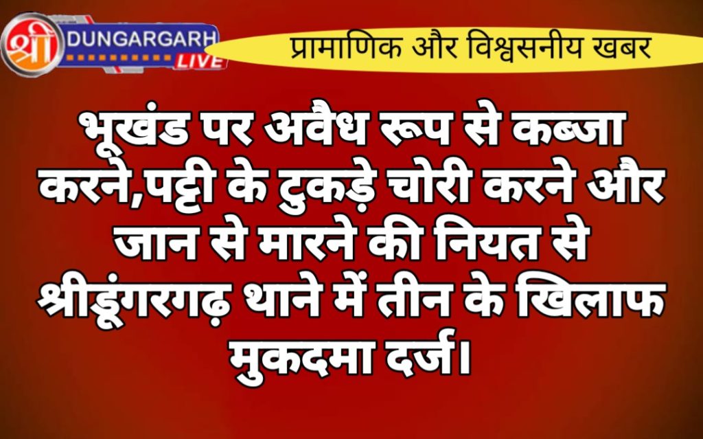 श्रीडूंगरगढ़ थाने में मुकदमा दर्ज करवाते हुए सहीराम पुत्र चांदराम जाति सांसी उम्र 65 साल निवासी मोमासर ने बताया की मेरे गांव में ही एक पैतृक भूखंड है प्रार्थी कामासर में मृत पशुओं को उठाने का काम करता है गांव में नही होने पर आरोपी मामराज पुत्र सुगनाराम, जैसाराम पुत्र सुगनाराम, सुगनाराम पुत्र चांदराम जाति सांसी निवासी मोमासर ने प्राथी के भूखंड पर कब्जा कर लिया और 10 पट्टी के टुकड़े ले गए। जब प्रार्थी को इसकी सूचना मिली तब वह अपने भूखंड पर गया तब आरोपी वहीं मौजूद थे प्रार्थी ने आरोपियों को ओलमा दिया। तब आरोपियों ने धमकी देते हुए चाकू छुरी निकाले और कहा कि यहां से निकल जा नहीं तो तेरे को जान से मार देंगे हमारी ऊंची पहुंच है हमने भूखंड अपने नाम करवा लिया है श्रीडूंगरगढ़ थाने में तीनों आरोपियों के खिलाफ मुकदमा दर्ज कर लिया है और आगे की जांच एसआई उदय सिंह को सौंप दि है।