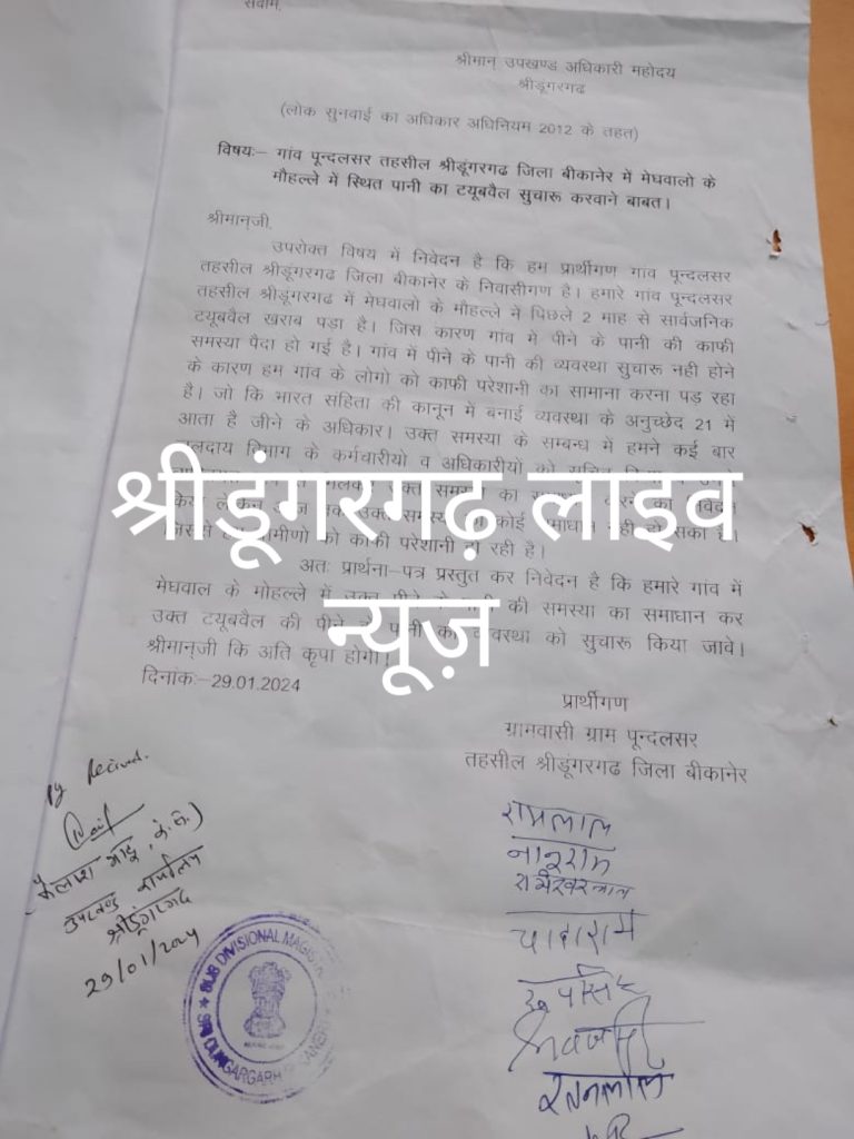 श्रीडूंगरगढ़ क्षेत्र के गांव पुंदलसर के निवासी आज उपखंड अधिकारी से मिलकर पानी की समस्या के बारे में अवगत करवाया। ग्राम वासियों ने बताया कि गांव के मेघवालों के मोहल्ले में ट्यूबेल पिछले दो महीने से बंद पड़ा हैं मोहले वासियों में पानी को लेकर बहुत बड़ा संकट खड़ा हो गया है ग्राम वासियों ने बताया की कई बार कर्मचारियों और अधिकारियों को बंद पड़ा टयुबेल के बारे में अवगत करवाया लेकिन कोई इस समस्या का निवारण नही हुआ । और आज एक बार फिर ग्रामवासी उपखंड मुख्यालय पर पहुंचे और पानी की समस्या को लेकर ज्ञापन दिया ।