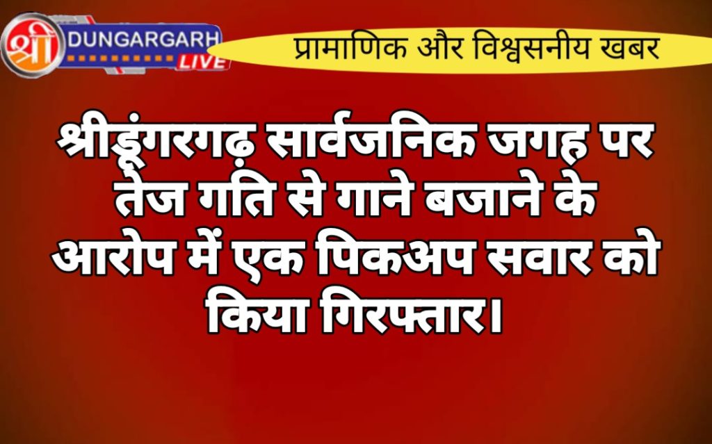 श्रीडूंगरगढ़ पुलिस टीम ने गस्त के दौरान एक पिकअप गाड़ी में तेज गति से गाने बजाने पर दो युवक को अलग अलग जगह से किया गिरफ्तार कर लिया । रूपा देवी स्कूल के पास सार्वजनिक जगह पर एक पिकअप को रोक कर पुलिस ने ड्राइवर से अपना नाम पूछा तो उसने बताया भागीरथ पुत्र मालाराम जाट उम्र 23 साल निवासी रीड़ी पिकप गाड़ी नंबर आरजे 07 जीडी 9166 बताया । वही नानू देवी चांडक स्कूल के पास ट्रेक्टर में तेज गति से गाने बजाने पर युवक को गिरफ्तार किया युवक का नाम। हुनता राम पुत्र भंवर लाल जाट उम्र 23 साल निवासी कालू बास को गिरफतार किया ।सार्वजनिक जगह स्कूल के सामने तेज गति से गाने बजाने के आरोप में पुलिस ने युवक को गिरफ्तार कर लिया है और आगे की जांच एसआई पूर्णमल को शॉप दी है।