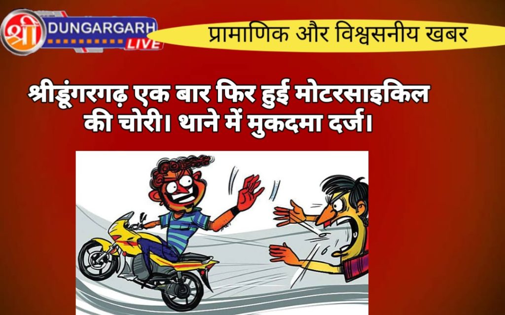 श्रीडूंगरगढ़ शहर में एक बार फिर से मोटरसाइकिल की चोरी हुई है। श्रीडूंगरगढ़ थाने में मोटरसाइकिल चोरी का मुकदमा दर्ज करवाते हुए नेमचंद पुत्र पूसाराम जाती जाट उम्र 46 साल निवासी कालुबास ने बताया की मेरी मोटरसाइकल आज से दो माह पूर्व में चोरी हुई थी । सरकारी अस्पताल के पास मोटरसाइकल खड़ी करके डॉक्टर को चेक करवाने गया था जब वापस आया तो मुझे मेरी मोटरसाइकिल नहीं मिली कोई अज्ञात व्यक्ति मोटरसाइकिल की चोरी करके ले गया श्रीडूंगरगढ़ थाने में आज मोटरसाइकिल चोरी का मुकदमा दर्ज कर लिया है और आगे की जांच बलवीर सिंह को सौंप दी है।