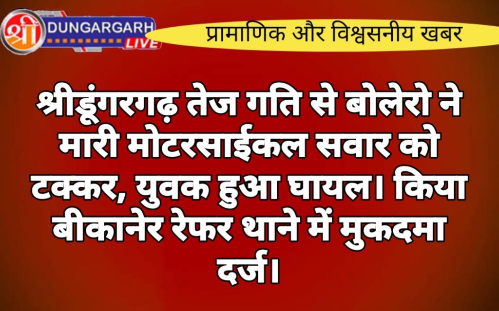 सेरूणा थाने में मुकदमा दर्ज करवाते हुए श्रीकृष्ण कुमार पुत्र मोतीराम जाती बंजारा उम्र 22 साल निवासी साहवा ने बताया की की शुक्रवार को मैं बीकानेर से साहवा की तरफ जा रहा था रास्ते में झझेऊ के पास सामने से एक तेज गति से बोलोरो गाड़ी आरजे19 UC 6014 ने टक्कर मार दी। बाइक सवार युवक घायल हो गया मोटरसाइकिल पूरी टूट गई। बाइक सवार युवक श्रीडूंगरगढ़ लाया गया यहां प्राथमिक उपचार के बाद एंबुलेंस से बीकानेर रैफर कर दिया । बोलेरों की टक्कर से युवक का एक पैर और एक हाथ टूट गया। बीकानेर इलाज चल रहा है। सेरूणा थाने में अज्ञात बोलेरो चालक के खिलाफ मुकदमा दर्ज कर लिया और आगे की जांच एसआई राजकुमार को शॉप दी है।