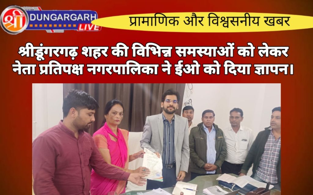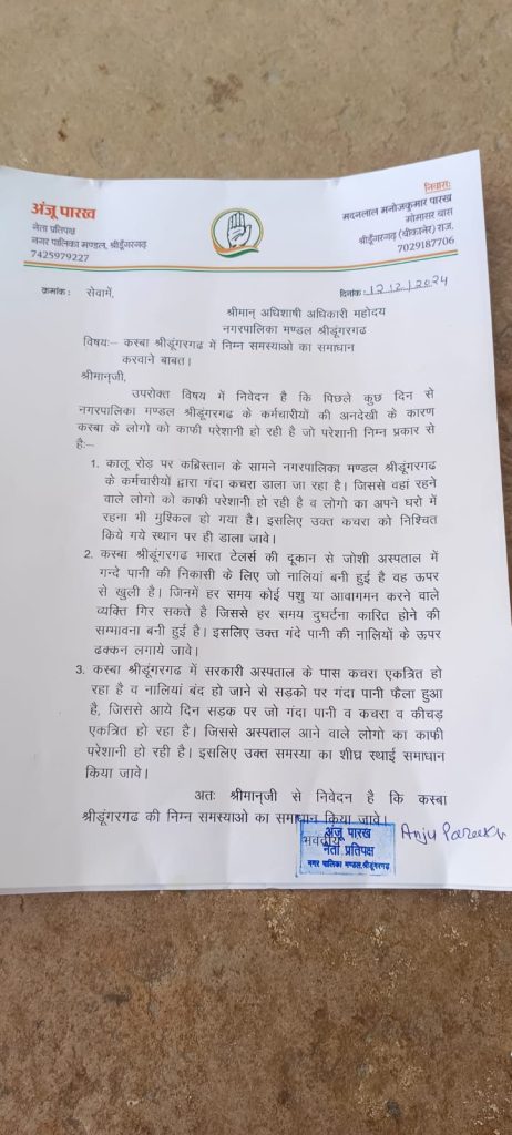 श्रीडूंगरगढ़ में विभिन्न समस्याओं का समाधान के लिए आज नेता प्रतिपक्ष नगरपालिका अंजू पारख ने अभिशाषी अधिकारी को ज्ञापन दिया । जिसमे नेता प्रतिपक्ष ने बताया की कर्मचारीयों की अनदेखी के कारण कस्बा के लोगो को काफी परेशानी हो रही है कालू रोड़ पर कब्रिस्तान के सामने नगरपालिका मण्डल श्रीडूंगरगढ के कर्मचारीयों द्वारा गंदा कचरा डाला जा रहा है। जिससे वहां रहने वाले लोगो को काफी परेशानी हो रही है व लोगो का अपने घरो में रहना भी मुश्किल हो गया है। इसलिए उक्त कचरा को निश्चित किये गये स्थान पर ही डाला जावे।