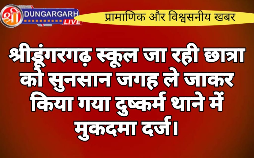 श्रीडूंगरगढ़ क्षेत्र में बड़ी ही शर्मनाक घटना निकलकर सामने आ रही है जहां घर से स्कूल जा रही एक छात्रा को गांव के ही एक युवक द्वारा स्कूल छोड़ने बोलकर बाइक पर बिठाकर सुनसान जगह पर ले जाकर दुष्कर्म करने की वारदात सामने आई है। पीड़िता के परिजनों द्वारा पुलिस थाने में एक नामजद दो अन्य के खिलाफ पुलिस थाने में मुकदमा दर्ज करवाया गया है जिसके आधार पर पुलिस मामले की जांच में जुट चुकी हैं।