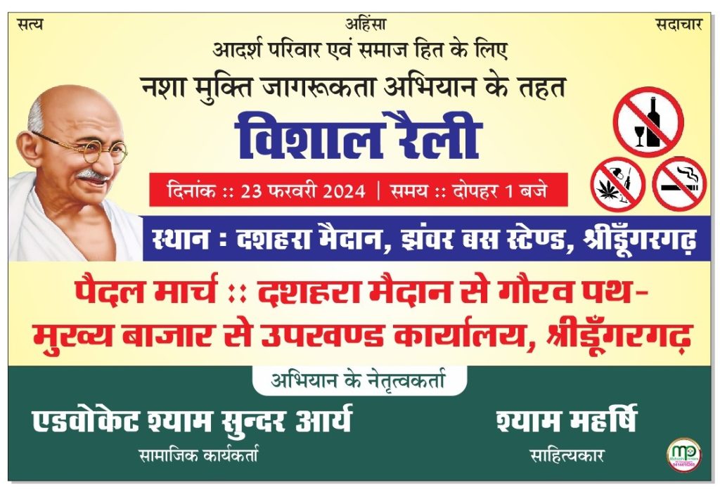 नशा मुक्ति जागरूकता अभियान के तहत विशाल रैली का आयोजन 23 फरवरी 2024 को श्रीडूंगरगढ़ में किया जा रहा है । सामाजिक कार्यकर्ता एडवोकेट श्याम सुंदर आर्य ने बताया कि आदर्श परिवार एवं समाजहित के लिए आमजन नशा मुक्त हो इसलिए नशा मुक्ति जागरूकता अभियान के तहत 23 फरवरी को दशहरा मैदान झंवर स्टेण्ड से गौरव पथ – मुख्य बाजार से उपखण्ड कार्यालय श्री डूंगरगढ़ तक पैदल मार्च निकाला जाएगा ।साहित्यकार श्याम महर्षि ने बताया कि इस पैदल मार्च में बड़ी संख्या में शहरी एवं ग्रामीण क्षेत्र के विद्यार्थी एवं आमजन की भागीदारी रहेगी । राष्ट्र के उच्च नैतिक मूल्यों हेतु प्रत्येक नागरिक नशा मुक्त हो । राष्ट्रीय नैतिक मूल्यों की पुनर्स्थापना में प्रत्येक नागरिक की भागीदारी हो इसलिए नशा मुक्ति महारैली में आमजन से भागीदारी की अपील है ।