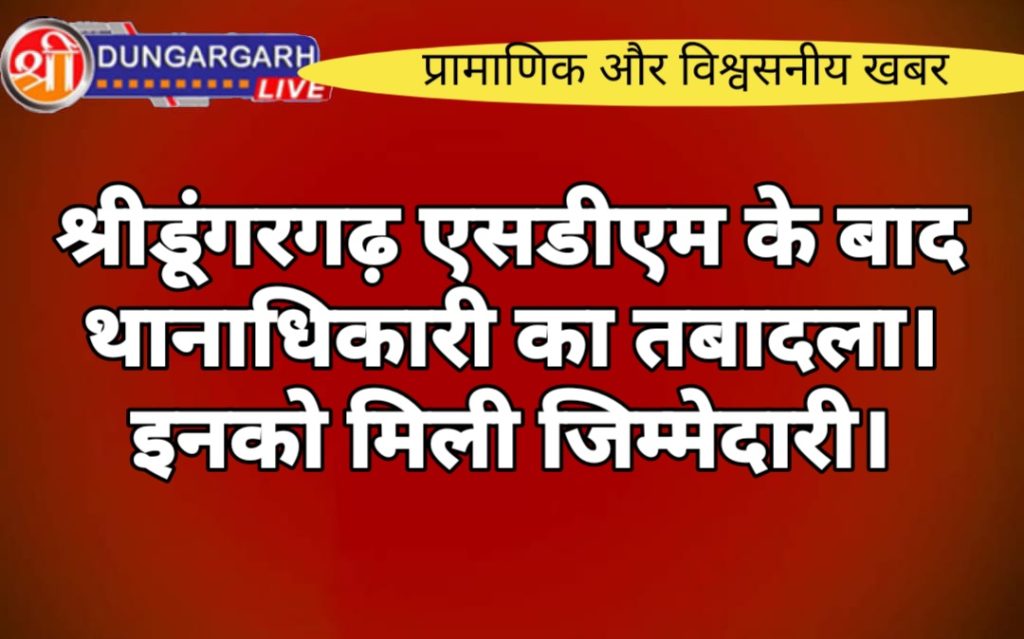 प्रदेश में नई सरकार गठन के बाद तबादलों का दौर शुरू हो गए बीती रात 396 RAS अधिकारियों के तबादले के बाद बीकानेर एसपी ने भी कई थाने के सीआई और एसआई बदल दिए। श्रीडूंगरगढ़ थानाअधिकारी का जिमा इंद्र कुमार को दिया गया हैं निवर्तमान थानाधिकारी अशोक बिश्नोई को जिला कंट्रोल रूम का प्रभारी बनाया गया है। सेरूणा में थानाधिकारी इंद्रलाल को श्रीडूंगरगढ़ भेजा गया है। और सेरूणा थाने में पवन शर्मा को थानाधिकारी लगाया गया हैं ।