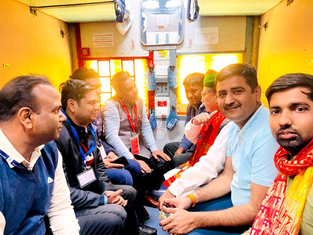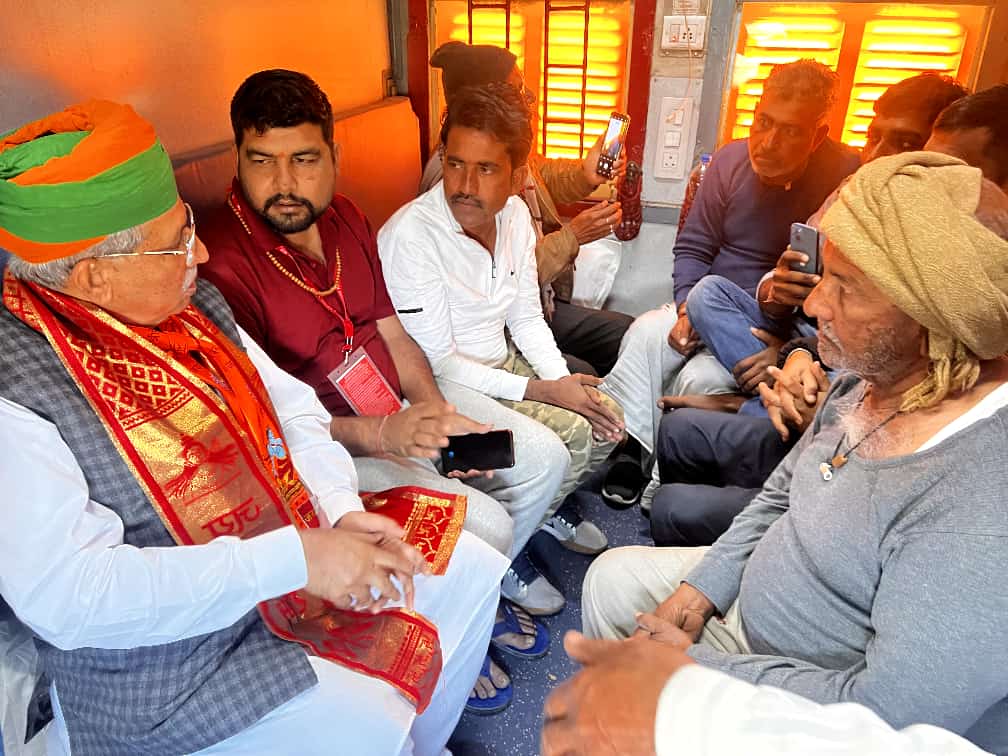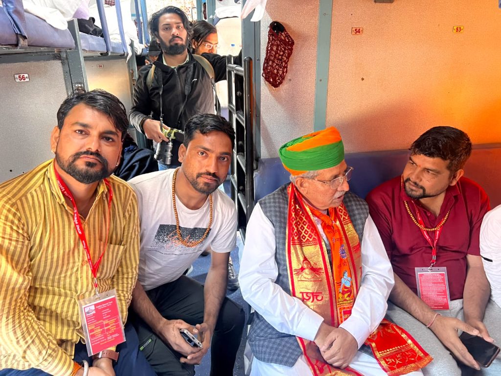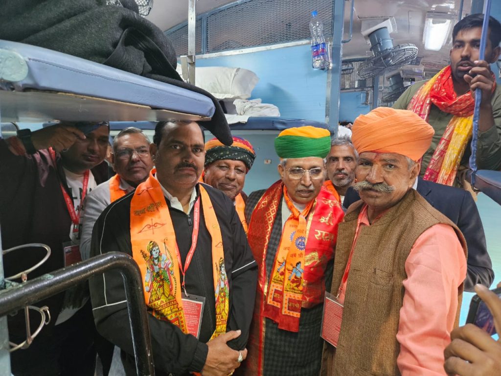 आज केन्द्रीय मंत्री अर्जुनराम मेघवाल ने रेल मंत्रालय द्वारा अयोध्या दर्शन के लिए शुरू की गई ‘आस्था स्पेशल ट्रेन’ से प्रभु श्रीराम के दर्शन कर लौट रहे बीकानेर वासियों से ट्रेन में मुलाक़ात कर दर्शनार्थियों से यात्रा के अनुभव व व्यवस्थाओं की जानकारी प्राप्त की। मंत्री जी को ट्रेन में सवार श्रद्धालुओं ने बताया की सदियों की प्रतिक्षा के पश्चात रामलला के दिव्य दर्शन का सौभाग्य प्राप्त हुआ इसके लिए ट्रेन में सवार श्रद्धालुओं ने प्रधानमंत्री नरेंद्र मोदी, उत्तर प्रदेश के मुख्यमंत्री योगी आदित्यनाथ और यह शानदार ट्रेन द्वारा सफर के लिए अर्जुन राम मेघवाल का आभार व्यक्त किया। यात्रा के दौरान मेघवाल ने सभी श्रद्धालुओं को खाने के फूड पैकेट वितरित करवाए इस दौरान जिला महामंत्री और आस्था स्पेशल ट्रेन के रेल प्रभारी श्याम पंचारिया,जिला महामंत्री महेश मुंड,श्याम सुंदर चौधरी,नोखा देहात के मंडल अध्यक्ष रामकुमार जाखटीया, पूर्व जिला परिषद सदस्य हेमनाथ जाखड़, पूर्व किसान मोर्चा जिला अध्यक्ष थान सिंह भाटी,सोशल मीडिया जिला संयोजक पवन स्वामी,भवानी शंकर खत्री, मुकेश पंवार,रेवन्त सैन,सहित पार्टी पदाधिकारी और श्रद्धालु यात्रा में साथ मौजूद रहे ।