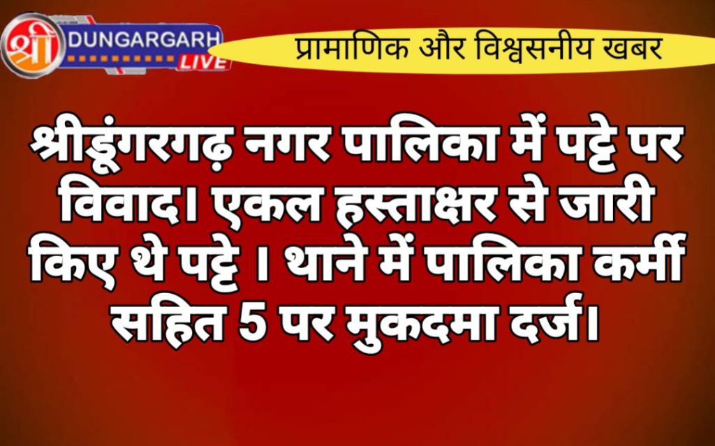 श्रीडूंगरगढ़ थाने में मुकदमा दर्ज करवाते हुए सूरजभान पुत्र रामलाल प्रजापत उम्र 38 साल वर्तमान में नगर पालिका एलडीसी पद पर कार्यरत है यहां गत सरकार के कार्यकाल में 8 फरवरी 2023 को मुख्य बाजार में पोस्ट ऑफिस के पास पालिका की नजूल संपति में से चार दुकानों के पट्टे जारी कर दिए गए थे। अब जांच के बाद एम्पावर्ड कमेटी ने 4 मार्च 2024 को बैठक कर इन चारों पट्टों को निरस्त कर दिया है। पट्टे निरस्त करने के साथ ही नगरपालिका कार्मिक सूरजभान की रिपोर्ट पर श्रीडूंगरगढ़ पुलिस थाने में इन पट्टों के आवेदक दीनदयाल सोनी, जुगल किशोर सोनी, रतिराम प्रजापत, पोकरमल सिंधी व पालिका के तत्कालीन भूमि शाखा प्रभारी रविशंकर जोगी के खिलाफ नियमविरुद्ध एकल हस्ताक्षर से पट्टे जारी करने और पत्रावलियों को चोरी करने का आरोप लगाते हुए मामला दर्ज करवाया गया है। मामले की जांच एसआई धर्मपाल को सौंपी गई है।