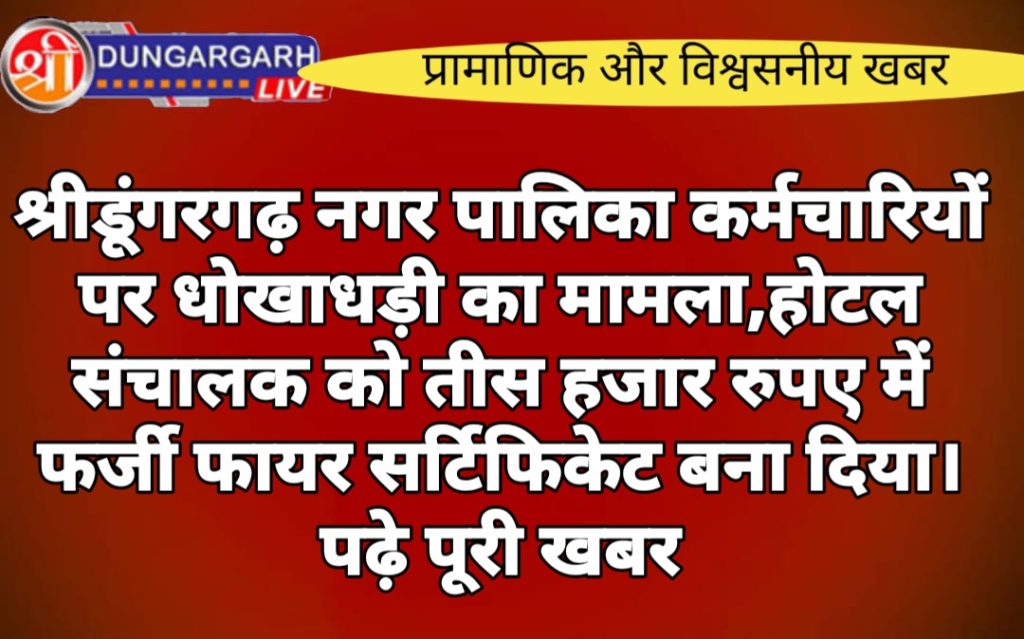 श्रीडूंगरगढ़ नगर पालिका के कर्मचारियों ने एक होटल संचालक को फर्जी फायर सेफ्टी सर्टिफिकेट बनाकर दे दिया। इसके बदले उससे तीस हजार रुपए भी लिए। इसी तरह के आरोप लगाते हुए होटल संचालक ने श्रीडूंगरगढ़ थाने में धोखाधड़ी का मामला दर्ज करा दिया है।कस्बे के आशीष होटल के संचालक मामराज तर्ड ने पुलिस को बताया कि उसने अपनी होटल में बार खोलने के लिए फायर सेफ्टी सर्टिफिकेट के लिए आवेदन किया था। इसके लिए नगर पालिका के अधिशासी अधिकारी कुंदनमल देथा और लिपिक सूरजभान को आवेदन दिया। इन दोनों ने फायर सेफ्टी सर्टिफिकेट बनाकर दे दिया। इसके बदले तीस हजार रुपए भी लिए गए। बार के लिए आवेदन करते हुए इस सर्टिफिकेट को आबकारी विभाग को भेजा तो पता चला कि ये फर्जी है। आबकारी विभाग ने ही मामराज तर्ड को बताया कि सर्टिफिकेट फर्जी पेश किया गया है। इस पर मामराज ने पालिका के अधिशासी अधिकारी व लिपिक के खिलाफ धोखाधड़ी करने का मामला दर्ज करा दिया। आरोप है कि संबंधित कर्मचारी से सर्टिफिकेट फर्जी होने की बात कही गई तो उसे धमकाया गया। अब पुलिस इस मामले की छानबीन कर रही है। इससे आबकारी विभाग से फर्जी सर्टिफिकेट लेकर फायर सेफ्टी अधिकारियों से पूछताछ की जाएगी। आरोप साबित होने पर कार्रवाई होगी।