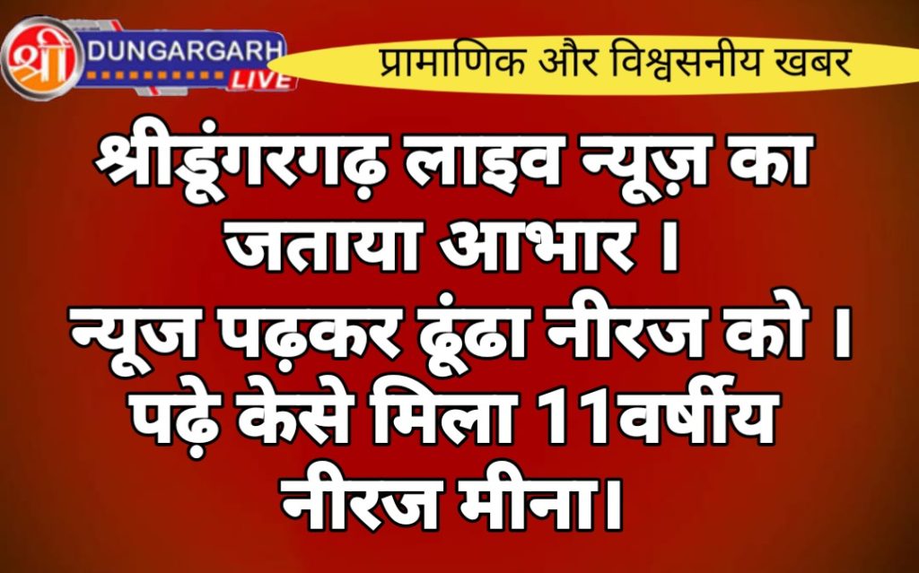 श्रीडूंगरगढ़ घर से ट्यूशन की ओर गया 11 वर्षीय नीरज बीकानेर रेलवे स्टेशन पर 12.15 रात्रि को पुलिस ने डिटेन किया । पढ़ने में होशियार और समय पर घर आने वाले नीरज मीना शाम के 5 बजे से रात्रि 12.15 तक करीबन 7 घंटे गायब रहने की पूरी जानकारी श्रीडूंगरगढ़ लाइव न्यूज़ पर।