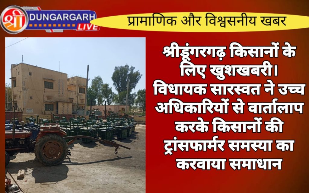 श्रीडूंगरगढ़ में बिजली ट्रांसफार्मर की किल्लत किसानों के लिए बड़ी समस्या बनी हुई थी विधायक ताराचन्द सारस्वत ने उच्च अधिकारियों से वार्ता की जिसकी बदौलत आज फिर 46 से अधिक ट्रांसफार्मर का जेट श्रीडूंगरगढ़ पहुंचा है ज्ञात रहे पिछले दो हफ़्ते से लगातार विधायक के द्वारा अधिकारियों पर दबाव देने के बाद अब तक 150 के लगभग नए ट्रांसफार्मर श्रीडूंगरगढ़ में पहुंच चुके है जो किसानों के लिए बड़ी राहत है जिससे क्षेत्र के किसानों में खुशी का माहौल है और बिजली संबधित एक बड़ी समस्या का समाधान भी हुआ है । विधायक सारस्वत द्वारा उच्च अधिकारियों से हुई वार्तालाप के अनुसार आने वाले दो हफ्तों में लम्बित ट्रांसफार्मर की समस्या से श्रीडूंगरगढ़ को पूर्णत: निजात मिल सकेगा ।