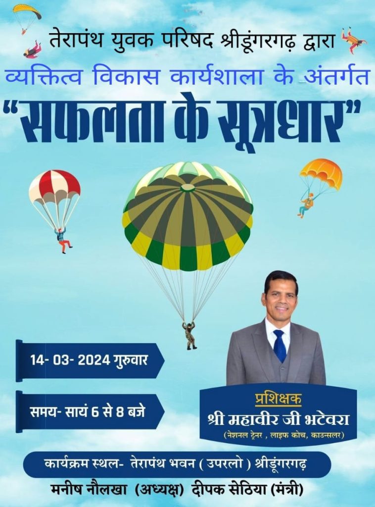 अखिल भारतीय तेरापंथ युवक परिषद के निर्देशन में थली संभाग की पहली सीपीएस करवाने वाली तेरापंथ युवक परिषद, श्रीडूंगरगढ़ ने एक बार फिर एक नई कार्यशाला सफलता के सूत्रधार का सफल आयोजन किया। प्रशिक्षक श्री महावीर जी भटेवरा(नेशनल ट्रेनर,लाइफ कोच, काउंसलर) ने कार्यशाला में जीवन में सफलता प्राप्त करने के लिए आने वाली रुकावटों को दूर करने तथा सफलता हासिल करने के लिए किए जाने वाले प्रयासों की जानकारी देते हुए बताया कि सकारात्मक सोच, ऊर्जा, क्रोध नियंत्रण, समय का प्रबंधन, अनदेखा, अपेक्षाएं, आदि बिंदुओं पर विस्तार से चर्चा करते हुए मनोरंजन के साथ प्रभावशाली ढंग से बताया।कार्यक्रम की शुरुवात तेयुप के पूर्व अध्यक्ष प्रदीप जी पुगलिया ने की, स्वागत भाषण तेयूप अध्यक्ष मनीष जी नौलखा ने दिया।कार्यक्रम में तेरापंथ युवक परिषद के पधाधिकारी, कार्यसमिति सदस्य, आजीवन सदस्य, किशोर मंडल के सदस्य, सीपीएस के संभागी, तेयुप परामर्शक अशोक जी बैद, अणुव्रत समिति से सत्यनारायण जी स्वामी, ऐडवोकेट रणवीर जी खींची शिक्षाविद करणीसिंह जी आदि लोगों की उपस्तिथि रही।कार्यक्रम का कुशल संचालन कार्यक्रम संयोजक मनीष जी पटावरी ने किया।