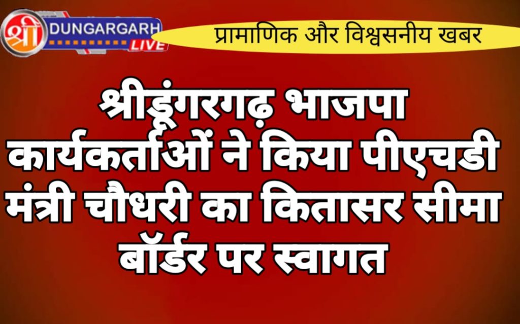 जन स्वास्थ अभियांत्रिकी एंव भू जल विभाग मंत्री श्रीकन्हैयालाल जी चौधरी का बीकानेर जाते समय आज सुबह श्रीडूंगरगढ़ विधानसभा की सीमा बॉर्डर पर गांव कितासर के एंट्री द्वार पर भाजपा कार्यकर्ताओ एवं पीएचडी अधिकारियों ने किया स्वागत । इस दौरानमंडल अध्यक्ष महावीर प्रजापत ने साफा पूर्व जिलाध्यक्ष रामगोपाल सुथार ने सॉल चेयरमैन मानमल शर्मा, महामंत्री महेश राजोतिया, सुरेन्द्र चुरा, पार्षद जगदीश गुर्जर, मूलचंद इंदोरिया,भवानी प्रकाश तावणीयां, कितासर से श्रवण सिंह,पृथ्वीराज शर्मा,भंवरलाल पुनियाँ,सवाइसिंह,मेघराज कितासर आदि ने माला और पार्टी का दुपट्टा पहनाकर स्वागत किया ।पीएचडी अधिकारियों में sc राजेश पुरोहित, एससी प्रोजे. राममूर्ति चौधरी,xen नरेश,aen मांगीलाल मीणा और जेईएन आदि ने गुलदस्ते भेंट करके स्वागत किया।पीएचडी मंत्री कन्हैयालाल चौधरी बीकानेर में लेंगे अधिकारियों की मीटिंग विधायक ताराचंद सारस्वत भी होंगे मीटिंग में शामिल ।