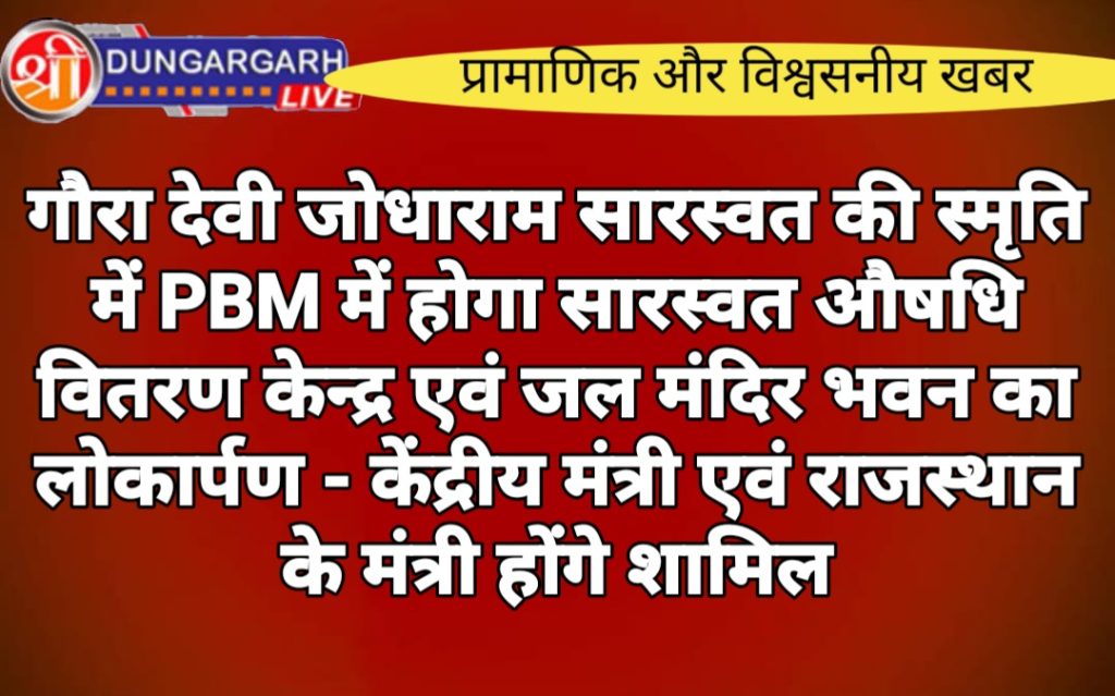 अपने दिवंगत माता पिता की पुण्य स्मृति में श्री डूंगरगढ़ विधायक ताराचन्द सारस्वत ने करवाया औषधि वितरण केन्द्र और जलमंदिर भवन का निर्माण ,कल होगा उद्घाटन।बीकानेर स्व. गौरा देवी जोधाराम सारस्वत की पुण्य स्मृति में उनके पुत्र श्री डूंगरगढ़ विधायक ताराचन्द सारस्वत ने राजकीय PBM अस्पताल परिसर में डायबीटीज विभाग के पास सारस्वत औषधि वितरण एवम जल मंदिर भवन का निर्माण करवाकर जन हित का कार्य किया।जिसका उद्घाटन एवम लोकार्पण दिनांक 16 मार्च 2024 को दोपहर 1:30 बजे केंद्रीय कानून एवं न्याय विभाग मंत्री अर्जुन राम मेघवाल,चिकित्सा मंत्री गजेन्द्र सिंह खींवसर, खाद्य एवं नागरिक आपूर्ति मंत्री सुमित गोदारा के द्वारा होगा।इस अवसर पर जिलाध्यक्ष जालम सिंह भाटी,खाजूवाला विधायक विश्वनाथ मेघवाल,नोखा पूर्व विधायक बिहारीलाल विश्नोई विशिष्ठ अतिथि मंत्री सहित वरिष्ठजन,पार्टी कार्यकर्ता एवं नागरीकगण शामिल होंगे।सारस्वत ने बताया कि इस औषधि वितरण केंद्र डी डी सी भवन में सरकार द्वारा 24 घंटे निःशुल्क दवाई वितरण होगा.