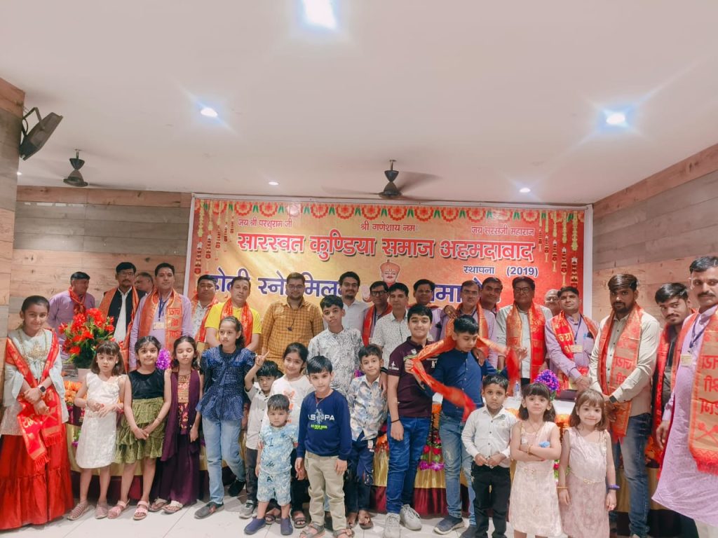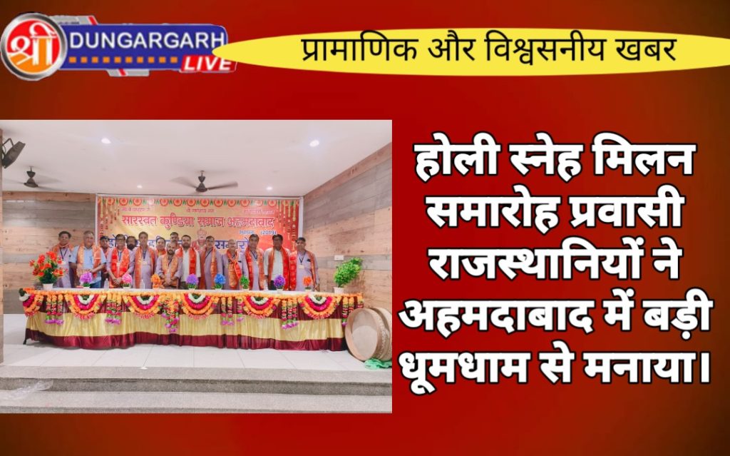 होली का पर्व चल रहा है श्रीडूंगरगढ़ में अनेक गांवों में होली के चंग ,गीत देखने को मिल रहे हैं हमारे श्रीडूंगरगढ़ के निवासी और प्रवासी राजस्थान भाई भी इस रंग में रंगे हुवे नजर आ रहे हैं अहमदाबाद में सारस्वत कुंडिया समाज स्थापना 2019 में हुई उन लोगो द्वारा रविवार दोपहर 2 बजे से रात्रि 10 बजे तक अपना तृतीय वार्षिक होली स्नेह मिलन समारोह का आयोजन किया गया, समाज के सभी सदस्यों के द्वारा श्री सरस जी महाराज की आरती के साथ प्रोग्राम की शुरूआत की एवम् महाप्रसादि के साथ कार्यक्रम का समापन हुआ, समारोह के मुख्य अतिथि सारस्वत कुंडिया समाज के अध्यक्ष फूसराज सहित श्रीतोलाराम ओझा, रमेश सारस्वा, किशन मोट, शिवकुमार मोट एवं आए हुए समाज के सभी गणमान्यों का दुपट्टा पहना कर स्वागत किया गया व श्री सरस जी महाराज की फोटो वितरण की गई। समाज के सदस्य जो सरकारी सेवा में ह उनको उज्ज्वल भविष्य की कामना के साथ प्रशस्ति पत्र प्रदान किया गया