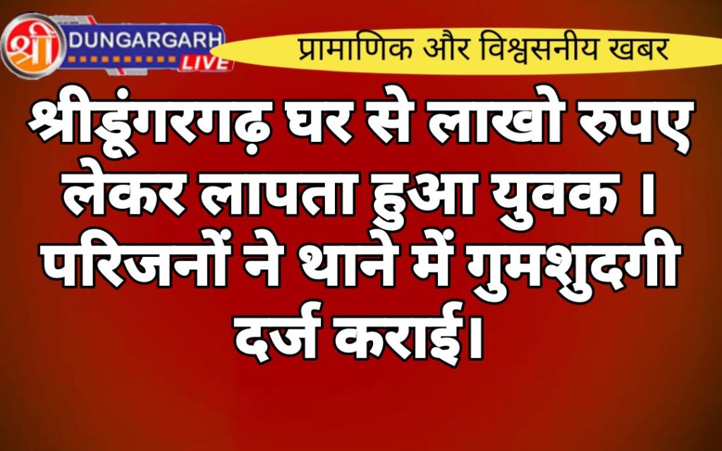 श्रीडूंगरगढ़ थाना क्षेत्र में बाना गांव निवासी मांगीलाल पुत्र मानाराम जाति जाट उम्र 46 साल ने अपने पुत्र की गुमशुदगी दर्ज कराई।युवक हुआ घर से लापता लाखों रुपए की रकम भी ले गया साथ चिंतित परिजन पहुंचे पुलिस थाने। परिवादी ने पुलिस को बताया की परिवार के साथ में खेत में चना की फसल को उखाड रहा था। दोपहर को दो बजे जब मैं घर पर आया तो मेरा बेटा मुखराम उम्र 20 साल घर पर नहीं था। हमने आस-पडौस में पता किया तो मेरा बेटा घर पर नहीं मिला। जाते समय घर से अपने साथ में करीब एक लाख बीस हजार रूपये भी लेकर के गया हैं। पुलिस में परिवादी की शिकायत पर गुमशुदगी में कर दिया है और मामले की जांच हेड कांस्टेबल बलबीर सिंह को सौंपी गई हैं।