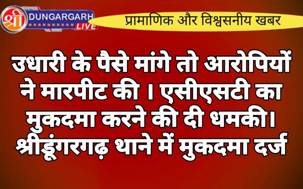 श्रीडूंगरगढ़ थाने में मुकदमा दर्ज करवाते हुए विक्रमसिंह पुत्र दीवान सिंह जाति राजपूत उम्र 35 साल निवासी जाखासर ने बताया की मैं खेत से गांव की तरफ आ रहा था तभी रास्ते में जीतू राम पुत्र झगनाराम जाति मेघवाल, कालूराम पुत्र खिराजाराम जाति मेघवाल वह एक अन्य लड़की साथ में थी मैंने जीतू राम से मेरे उधार दिए हुए ₹10000 मांगे तभी जीतू राम ने मेरे साथ मारपीट करना शुरू कर दि। गाली निकाली और मेरे सिर पर लाठी से वार किया तभी मेरे सिर में चोट लगी है और मुझे धमकी दी कि दोबारा पैसे मांगे तो एससी एसटी का मुकदमा कर दूंगा। श्रीडूंगरगढ़ थाने आरोपियों के खिलाफ मुकदमा दर्ज कर लिया है और आगे की जांच है पुलिस अधिकारी हरिराम को सौंप दि है
