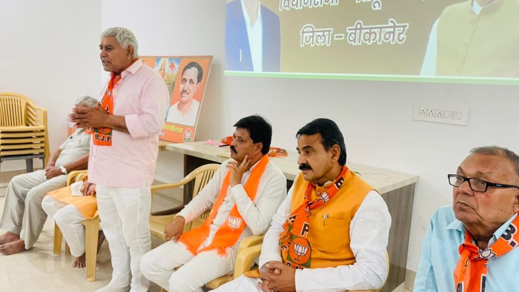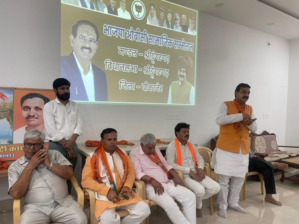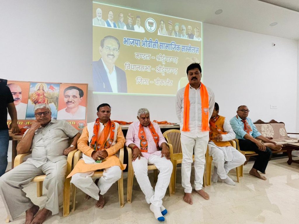 आज भाजपा कार्यालय श्रीडूंगरगढ़ में भाजपा ओबीसी मोर्चा द्वारा ओबीसी सामाजिक सम्मलेन किया जिसमें ताराचंद सारस्वत विधायक श्रीडूंगरगढ़ ,सुनील गहलोत ओबीसी मोर्चा जिला प्रभारी ,स्काउट गाइड के प्रदेश उपाध्यक्ष चांदरतन रांकावत, ओबीसी मोर्चा जिलाध्यक्ष विनोद गिरी गुंसाई,जिला उपाध्यक्ष शिव स्वामी,मंडल अध्यक्ष महावीर प्रजापत ने मंच साझा किया । इस दौरान विधायक ताराचंद सारस्वत ने कहा भाजपा प्रत्याशी अर्जूनराम मेघवाल को भारी मतों से विजय बनाने का आव्हान किया विधायक सारस्वत ने अपने संबोधन में कहा कि मुझे पूर्ण विश्वास है कि माननीय प्रधानमंत्री श्री नरेंद्र मोदी जी के सक्षम नेतृत्व व कर्मठ कार्यकर्ताओं की मेहनत के साथ बीकानेर में ‘राष्ट्रवाद व सुशासन’ का कमल खिलेगा । ओबीसी मोर्चा के प्रभारी सुनील गहलोत ने कहा कि देश के प्रधानमंत्री नरेंद्र मोदी भी ओबीसी समाज से आते हैं ओर ओबीसी समाज के लिए आज तक मोदी ने श्री विश्वकर्मा कौशल बोर्ड का गठन किया ताकि समाज के लोगो को कौशल मिल सके। इस दौरान ओबीसी मोर्चा के जिलाध्यक्ष विनोद गिरी ने सभी कार्यकर्ताओं को एकजुट होकर भाजपा प्रत्याशी को जिताने एवं तीसरी बार मोदी सरकार बनाने के लिए अपने योगदान की बात कही। मंडल अध्यक्ष महावीर प्रजापत ने मोदी सरकार की जनकल्याणकारी योजनाओं को अंतिम पंक्ति तक पहुंचाने की बात कही। इस दौरान भाजपा ओबीसी मोर्चा के पदाधिकारी एवं कार्यकताओं ने मंचासीन गणमान्यों का पार्टी का दुप्पटा पहनाकर स्वागत किया। इस दौरान नानूराम कुचेरिया ने भाजपा में शामिल हुए उनको पार्टी का दुपट्टा पहनकर भाजपा में शामिल किया गया देहात मंडल अध्यक्ष महेंद्र सिंह लखासर,पार्षद मगराज,शहर महामंत्री महेश राजोतिया, सोशल मीडिया जिला संयोजक पवन स्वामी,अनिल वाल्मीकि,भवानी सैनी,जेपी.स्वामी,नानूराम स्वामी,अशोक महावर,रमेश माली,विमल कुमार,राजेश नायक,राजू सिद्ध,ओमनाथ सिद्ध,नानूराम कुचेरिया,लोकेश सिद्ध,सोहनलाल प्रजापत,रेवन्त सैन,किशन पूरी, योगेश सारस्वत,विजयसिंह राजपुरोहित,भियानाथ सिद्ध,राजू,लेखराम सहित भाजपा कार्यकर्ता उपस्थित रहे।