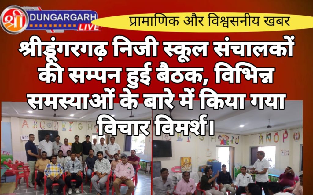 श्रीडूंगरगढ़ के शहरी निजी विद्यालय संचालकों की एक बैठक शुक्रवार स्थानीय एजी मिशन इंटरनेशनल स्कूल में आयोजित की गई।बैठक में निजि स्कूलों की विभिन्न समस्याओं के बारे में विचार विमर्श किया गया।बैठक की अध्यक्षता करते हुए शिक्षाविद्द मनीष कुमार शर्मा ने कहा कि राज्य सरकार जानबूझकर कर आरटीई का भुगतान नहीं कर रही है,जिससे निम्न व मध्यम वर्गीय स्कूलों की आर्थिक स्थिति खराब हो रही है।स्कूल संचालक मूलचन्द स्वामी ने कहा कि शिक्षा विभाग आरटीई का टाइम फ्रेम तो जारी करते हैं परन्तु उनका समय पर अमल नहीं किया जा रहा है।मनोज गुसाईं ने कहा कि निजी स्कूलों द्वारा कोरोना काल में ऑफ़लाइन पढ़ाये बच्चों का भुगतान भी अभी तक नहीं किया जाना निंदनीय है।इस अवसर पर आगामी वार्षिक परीक्षा, रिजल्ट,प्रवेश प्रक्रिया सहित विभिन्न मुद्दों पर चर्चा की गई।इस अवसर पर डॉ. रजनीश कौशिक,ओमप्रकाश स्वामी,प्यारेलाल ढुकिया,सुरेंद्र महावर,कुंभाराम घिंटाला,राकेश पारीक,अजय आचार्य,प्रमोद सारस्वत,कांतिप्रकाश दर्जी,विवेक उपाध्याय,मघराज प्रजापत, रामनिवास धायल,सूर्यकांत चूरा,रमेश व्यास व दुर्गाप्रसाद पालीवाल सहित अनेक निजी स्कूल संचालक उपस्थित रहे।