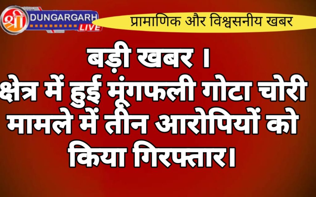 श्रीडूंगरगढ़ थाना क्षेत्र इलाके में जनवरी माह में हुई मूंगफली गोटा चोरी के मामले का पुलिस ने बड़ा खुलासा किया है और तीन आरोपियों को गिरफ्तार कर लिया। एएसआई रविंद्र सिंह से मिली जानकारी के अनुसार थाना क्षेत्र निवासी कानाराम तर्ड ने अपनी फैक्ट्री से मूंगफली के गोटा चोरी की घटना दर्ज करवाई थी। जिस पर थाना अधिकारी इंद्र कुमार के निर्देशन में पुलिस टीम द्वारा अनुसंधान किया गया और आज तीन आरोपीयो गुणा नंद पुत्र गिरधारी लाल प्रजापत आडसर बास, सांवर मल पुत्र सोहनलाल ब्राह्मण आड़सर बास, रामरत्न पुत्र सतुराम जाट आड़सर को गिरफ्तार किया गया है और आरोपियों से पुलिस कड़ी पूछताछ कर रही है और जल्दी ही माल को बरामद करेगी।