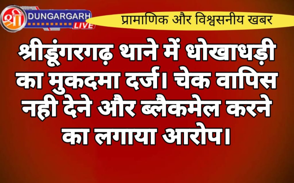 श्रीडूंगरगढ़ थाने में धोखाधड़ी का आरोप लगाते हुवे कालू निवासी चेनाराम ब्राह्मण ने आरोपी पर मुकदमा दर्ज करवाया है।कालू निवासी चैनाराम पुत्र शंकरलाल ब्राह्मण ने श्रीडूंगरगढ़ निवासी इंद्रचंद पुत्र नथाराम जाट के खिलाफ 420 का मामला दर्ज करवाया है। परिवादी ने पुलिस को बताया कि उसका पुत्र शिवप्रकाश सन 2019 के प्रारंभ से कलकत्ता में नौकरी करता था। इंद्रचंद कलकत्ता में व्यापार करता है जिसके कारण दोनों में जान पहचान हो गई। अगस्त 2019 में आरोपी परिवादी के पास आया और उसके पुत्र को 15 हजार के स्थान पर 20 हजार रूपए मासिक देकर नौकरी पर रख लिया। इस बाबत आरोपी ने परिवादी से स्टांप पर लिखा पढ़ी करने के नाम पर सादे कागज पर हस्ताक्षर करवा लिए और दो सादे चैक रखवा लिए। आरोपी ने पुत्र के नौकरी छोड़कर आने पर चैक लौटाने का विश्वास दिलवाया। उसके बेटे ने चार महीने आरोपी के यहां नौकरी की तथा जनवरी 2020 में वह नौकरी छोड़ कर गांव आ गया। कई बार आरोपी से चैक व स्टांप मांगे तो वह टालमटोल करता रहा। परिवादी ने बताया कि चार पांच दिन पहले आरोपी ने वकील के द्वारा नोटिस भेजा है व उसके चैक व स्टांप का दुरूपयोग किया है। आरोपी ने जैल भेजने की की दी है। पुलिस ने मामला दर्ज कर लिया है व आगे की जांच एसआई इंद्रलाल करेंगे।