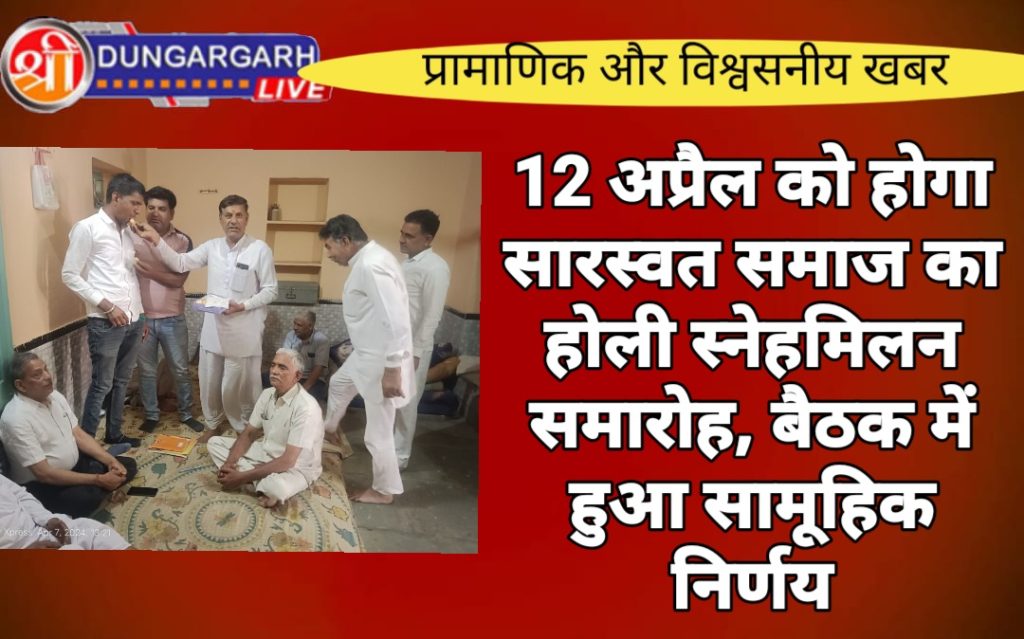 सारस्वत समाज कुंडिया की बैठक आज रविवार को श्रीडूंगरगढ़ सारस्वत भवन में समाज के अध्यक्ष बजरंग लाल ओझा की अध्यक्षता में सम्पन्न हुई। बैठक में मौजूद कानाराम सारस्वा जैतासर, सांवरमल सारस्वा, वेदप्रकाश सारस्वा आदि ने श्रीडूंगरगढ़ में समाज का होली स्नेहमिलन समारोह आयोजन का प्रस्ताव रखा जिसे सर्वसम्मति से उपस्थित सभी समाज बंधुओं ने स्वीकार किया। तोलाराम तावणियाँ ने कहा कि समाज के सभी वर्गों और क्षेत्र के सभी सामाजिक बंधुओ को होली के इस पावन पर्व व रंगोत्सव पर हर वर्ष सामाजिक स्नेह मिलन समारोह मनाया जाना चाहिए। समाज अध्यक्ष बजरंग लाल ओझा ने कहा कि इस आयोजन में क्षेत्र के सभी सामाजिक बन्धु शामिल होंगे। समाज के मंत्री काशीराम तावणियाँ ने कहा कि क्षेत्र के सभी व्यक्ति इस कार्यक्रम का हिस्सा हैं। कार्यक्रम 12 अप्रैल को सुबह 10 बजे से कस्बे के आडसर बास स्थित माहेश्वरी सेवा सदन में आयोजित होगा। सारस्वत युवा नवोत्थान के अध्यक्ष मनोज कायल को छ: न्याति ब्राह्मण महासंघ के श्रीडूंगरगढ़ सचिव बनाये जाने पर बधाई दी गयी। इस बैठक में मांगीलाल तावणियाँ, शंकरलाल मोट, नेमीचंद तावणियाँ, रामेश्वर सारस्वा, राजेश शर्मा, महावीर सारस्वत उपस्थित रहे।