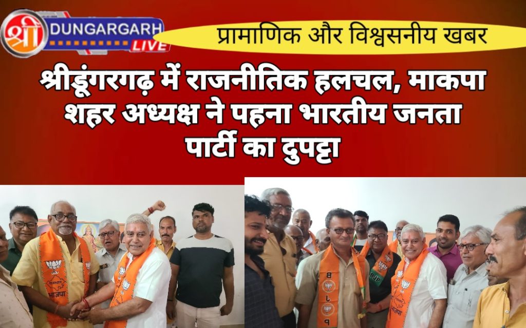 लोकसभा चुनाव में शहर में राजनैतिक हलचल को बढ़ा दिया है। चुनावी सरगर्मियों के बीच आज माकपा शहर अध्यक्ष ने भारतीय जनता पार्टी का दुपट्टा पहन लिया। देश के प्रधानमंत्री नरेन्द्र मोदी की जनकल्याणकारी योजनाओं और विकसित भारत के संकल्प से प्रभावित होकर श्री डूंगरगढ़ शहर माकपा अध्यक्ष रामेश्वर लाल बाहेती, कैलाश बाहेती, कांग्रेस पार्षद पूर्व प्रत्याशी अशोक भार्गव, चांदरतन राठी व पवन राठी ने भाजपा कार्यालय आकर विधायक ताराचन्द सारस्वत व मण्डल अध्यक्ष महावीर प्रजापत के सान्निध्य में भारतीय जनता पार्टी की सदस्यता ग्रहण की। इस अवसर पर भाजपा शहर उपाध्यक्ष मांगीलाल राठी, शहर महामंत्री महेश राजोतिया, सुरेन्द्र चूरा, संजय शर्मा, रजनीकांत सारस्वत, भवानी प्रकाश तावणियां, पवन इंदौरिया, अशोक महावर, गौरीशंकर तंवर, रजत आसोपा, तरुण छापोला, संदीप कायल, मांगीलाल तापड़िया, सुशील डागा, शिव मूंधड़ा सहित बड़ी संख्या में भाजपा कार्यकर्ता उपस्थित थी
