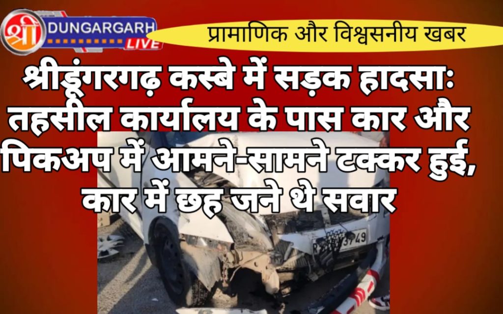 श्रीडूंगरगढ़ तहसील कार्यालय के सामने पिकअप और कार की टक्कर हो गई। टक्कर इतनी भीषण थी कि कार के आगे का हिस्सा पूरी तरह क्षतिग्रस्त हो गया। गनीमत रही कि कार में सवार छह जनों में कोई घायल नहीं हुआ।