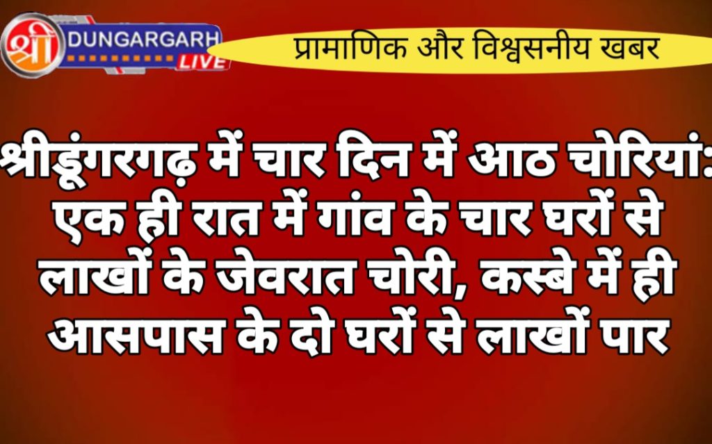 श्रीडूंगरगढ़ एरिया में इन दिनों चोरों की गैंग सक्रिय है। महज दो दिन में यहां आठ जगह चोरियां हुई। यहां तक कि दो सरकारी स्कूलों के ताले टूटे और लेपटॉप चोरी हो गए। कस्बे में भीड़भाड़ वाले क्षेत्र से चोर सोने-चांदी के गहने उठाकर ले गए और