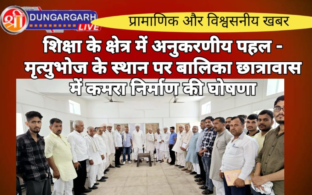 महर्षि दयानंद सरस्वती छात्रावास विकास समिति की बैठक श्री श्याम सुन्दर आर्य की अध्यक्षता में छात्रावास में आयोजित की गई । बैठक में सुशील सेरडिया ने आय – व्यय एवं छात्रावास में चल रहे विकास कार्यो की प्रगति रिपोर्ट प्रस्तुत की । जिसकी समीक्षा की गई । सर्वसम्मति से अनुमोदन किया गया । बैठक में स्वर्गीय धीराराम जी सारण एवं स्वर्गीय श्रीमती मनोहरी देवी सारण, बिग्गा की स्मृति इनके पुत्र श्री रामेश्वरलाल सारण ने बालिका छात्रावास में कमरा निर्माण की घोषणा की । बिग्गा सरपंच जसवीर सारण ने बताया कि रामेश्वरलाल सारण ने 1अप्रेल 2024 को अपनी माता मनोहरी देवी के स्वर्गवास के उपरान्त मृत्युभोज के स्थान पर शिक्षा के क्षेत्र में बालिका छात्रावास में कमरा बनाने का प्रण लिया था । स्वर्गीय दानाराम जी भामू, पूर्व प्रधान की स्मृति में बालिका छात्रावास के सभी कमरों में पंखे लगाने की घोषणा भामू परिवार द्वारा की गई । बैठक में हड़मानाराम भाम्भू, भींयाराम भामू , श्रवण कुमार भामू , सुभाष भामू ने पंखों हेतु राशी का चेक छात्रावास मैनेजमेंट को सौंपा । छात्रावास मैनेजमेंट कमेठी के अध्यक्ष एडवोकेट श्याम सुंदर आर्य ने कहा कि सारण परिवार बिग्गा ने मृत्युभोज के स्थान पर शिक्षा के लिए दान कर समाज के सामने वर्तमान समय की प्रासंगिकता का प्रेरणादायक कार्य एवं विचार प्रस्तुत किया है । जिसे समाज को ग्रहण करने की आवश्यकता है । बैठक में उपस्थित सदस्यों ने सारण परिवार बिग्गा एवं भामू परिवार मोमासर का आभार प्रकट किया । बैठक में लक्ष्मणराम खिलेरी, गणेश पोटलिया, कोडाराम भादू, सांवरराम महिया, प्रभुराम बाना, भंवरलाल खिलेरी, दुलाराम पूनियां, तोलाराम सिहाग, श्रवणराम जाखड़, हरिराम सारण, सहीराम सायच, हनुमान महिया, बजरंग भामू, भंवरलाल जाखड़, चरणसिंह सारण, रामरतन नेण, श्रीकृष्ण नेण, श्याम सारण सहित अनेक गणमान्यजन उपस्थित रहे । छात्रावास अधीक्षक श्रवण कुमार भामू ने सभी का आभार प्रकट किया ।