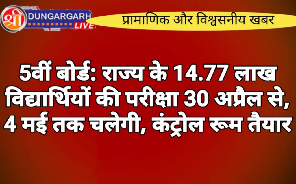 पांचवीं बोर्ड की परीक्षा 30 अप्रैल से शुरू होगी। शिक्षा विभाग ने परीक्षा की तैयारियों को अंतिम रूप दे दिया है। परीक्षा के सफल आयोजन को लेकर कंट्रोल रूम का गठन कर दिया गया है। राज्य स्तरीय कंट्रोल रूम पंजीयक शिक्षा विभागीय कार्यालय बीकानेर में बनाया गया है।